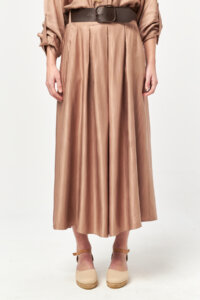 - High-waisted silhouette with a softly flared midi length