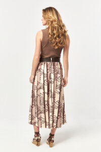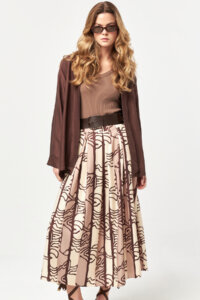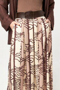 Fluid, pleated long silhouette meets a bold brown–beige print, crafted with recycled polyester for effortless movement and a conscious, modern look.