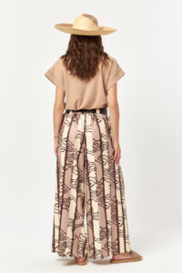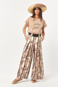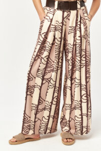 Fluid pleated wide-leg silhouette meets a bold brown–beige print, finished with side pockets and a waist-defining belt for effortless movement and modern comfort.