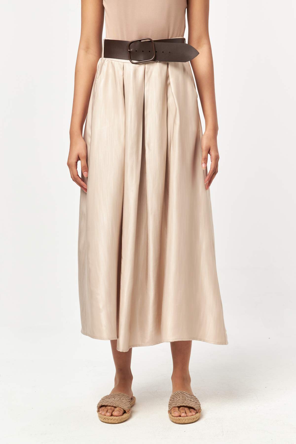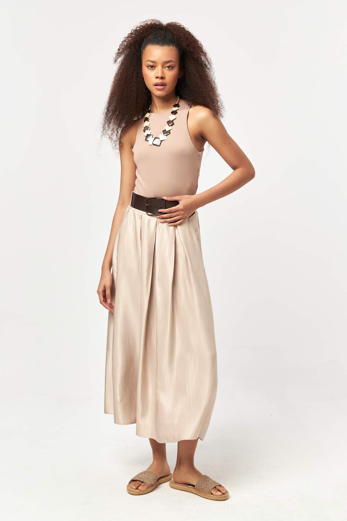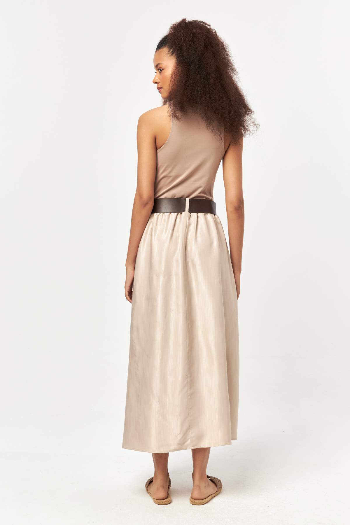 - High-waisted silhouette with a softly flared midi length