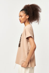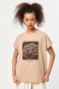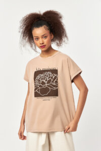 A relaxed-fit beige t-shirt featuring a refined placement floral print, crafted from a soft and breathable TENCEL™ blend for a smooth feel and effortless everyday style.