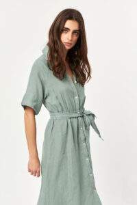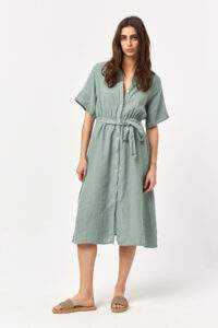 Finished in a soft mold powder shade, this linen shirt dress delivers a calm, airy feel with a naturally fluid silhouette. The lightweight linen texture and adjustable waist tie provide everyday comfort while maintaining a clean, effortless look—ideal for warm days, slow mornings, and relaxed summer styling.