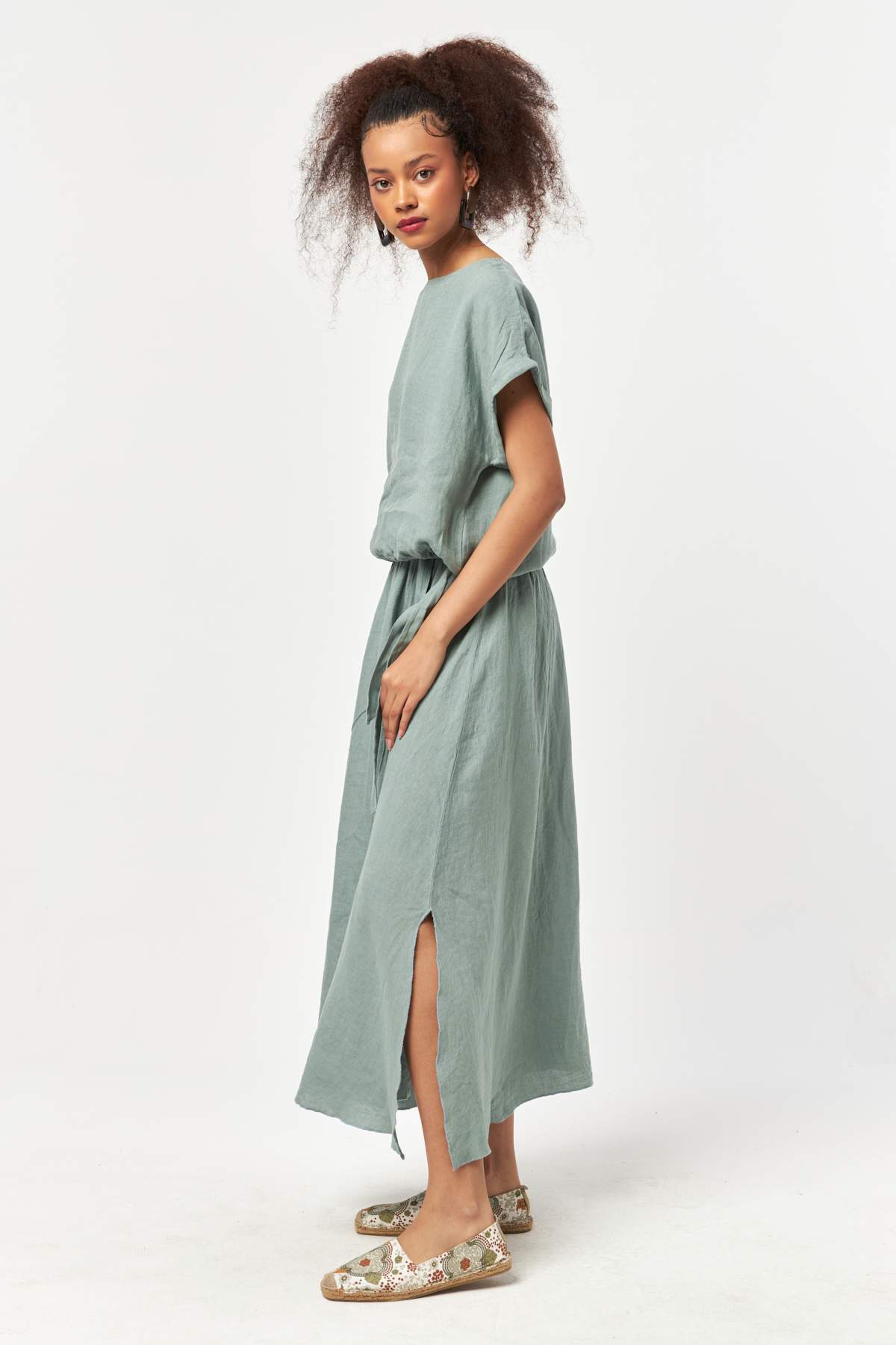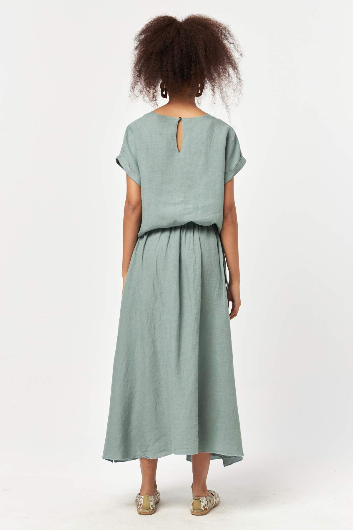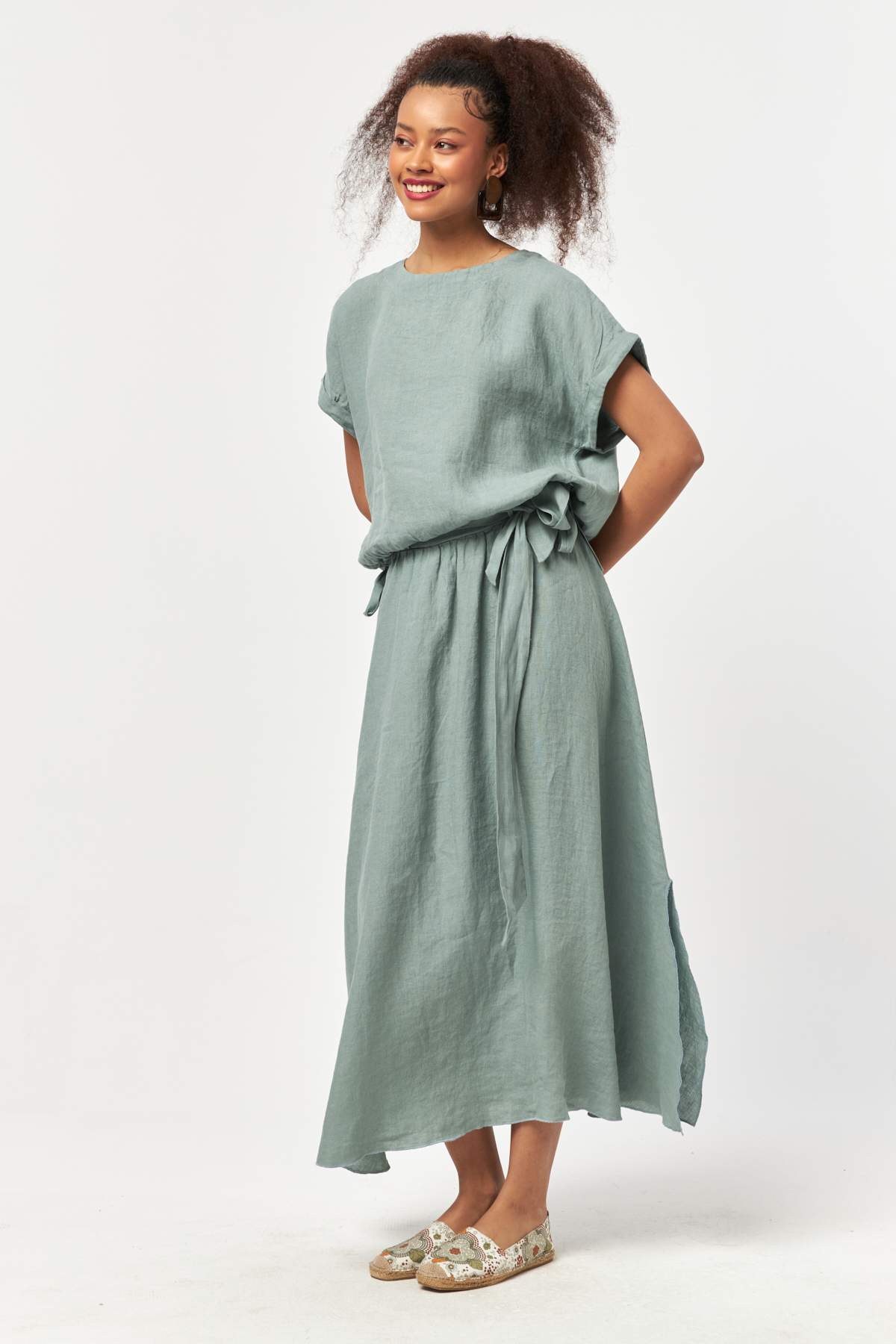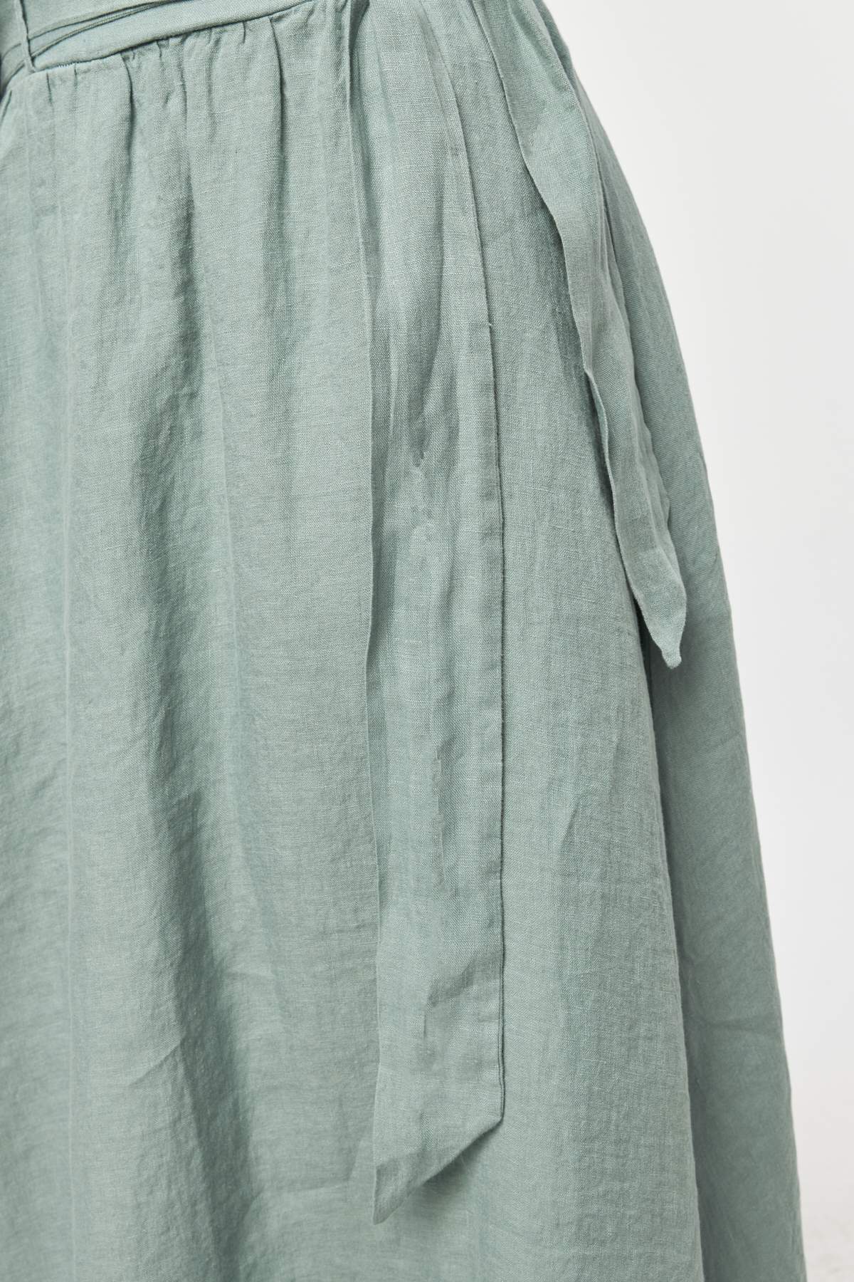 Presented in a soft mold powder shade, this linen skirt offers a calm, airy elegance with a naturally flowing silhouette. The lightweight linen fabric moves effortlessly, while the adjustable waist tie ensures all-day comfort. A subtle side slit adds ease of movement, making it a refined yet relaxed choice for warm-weather dressing.