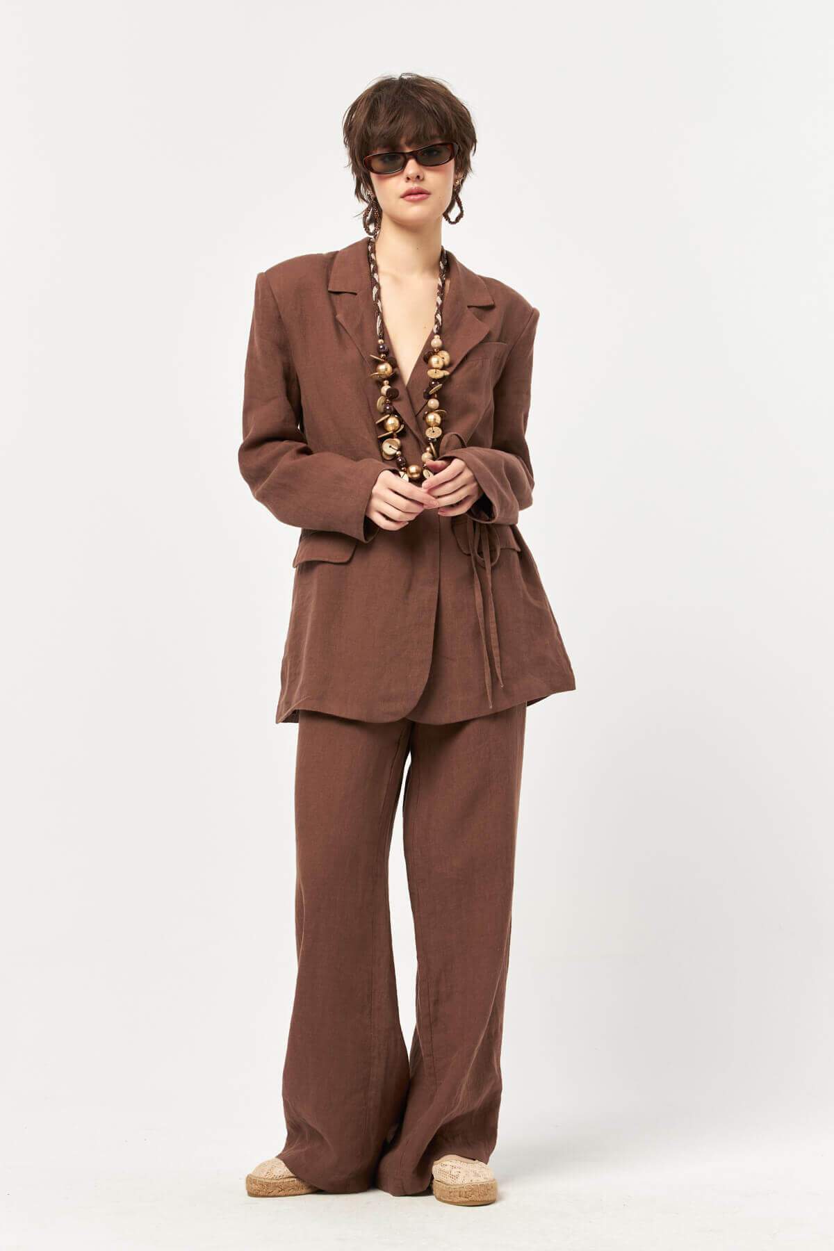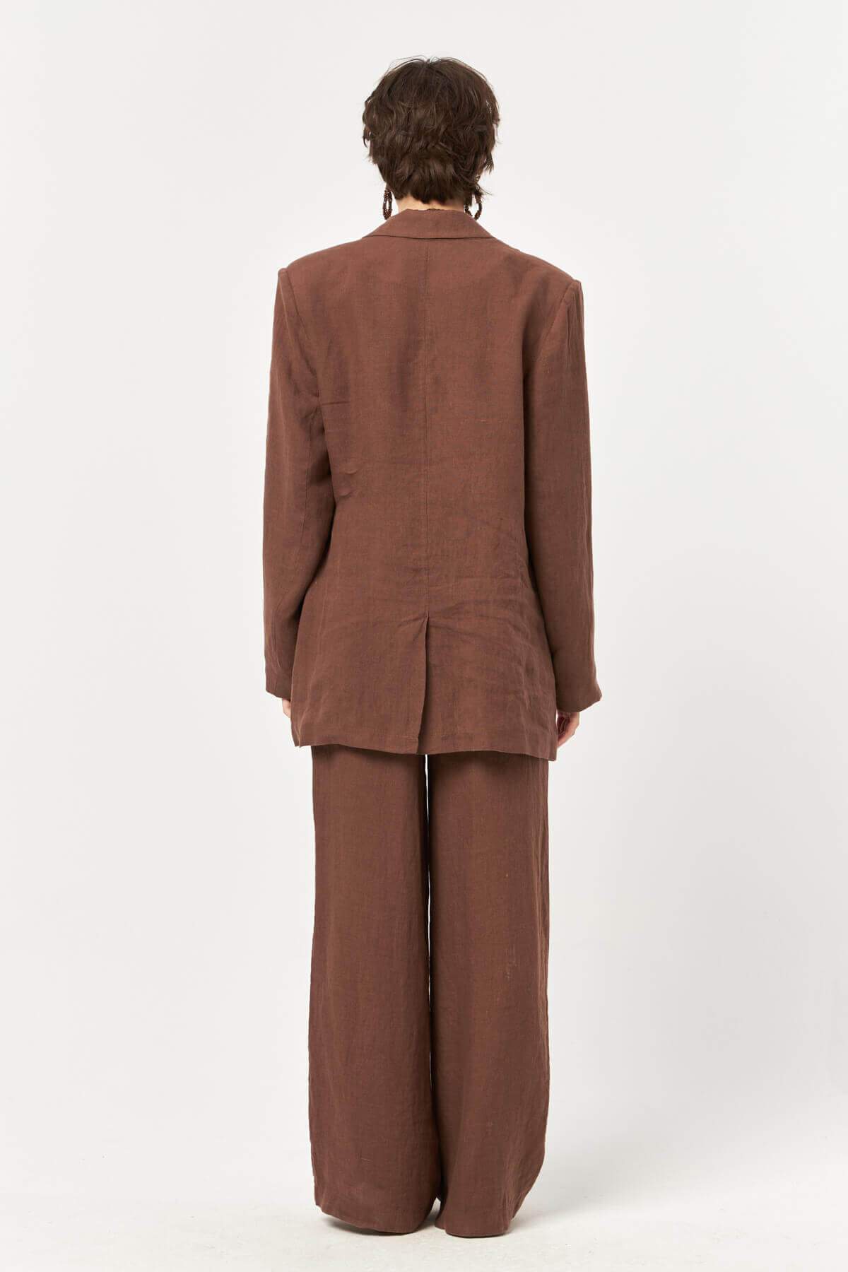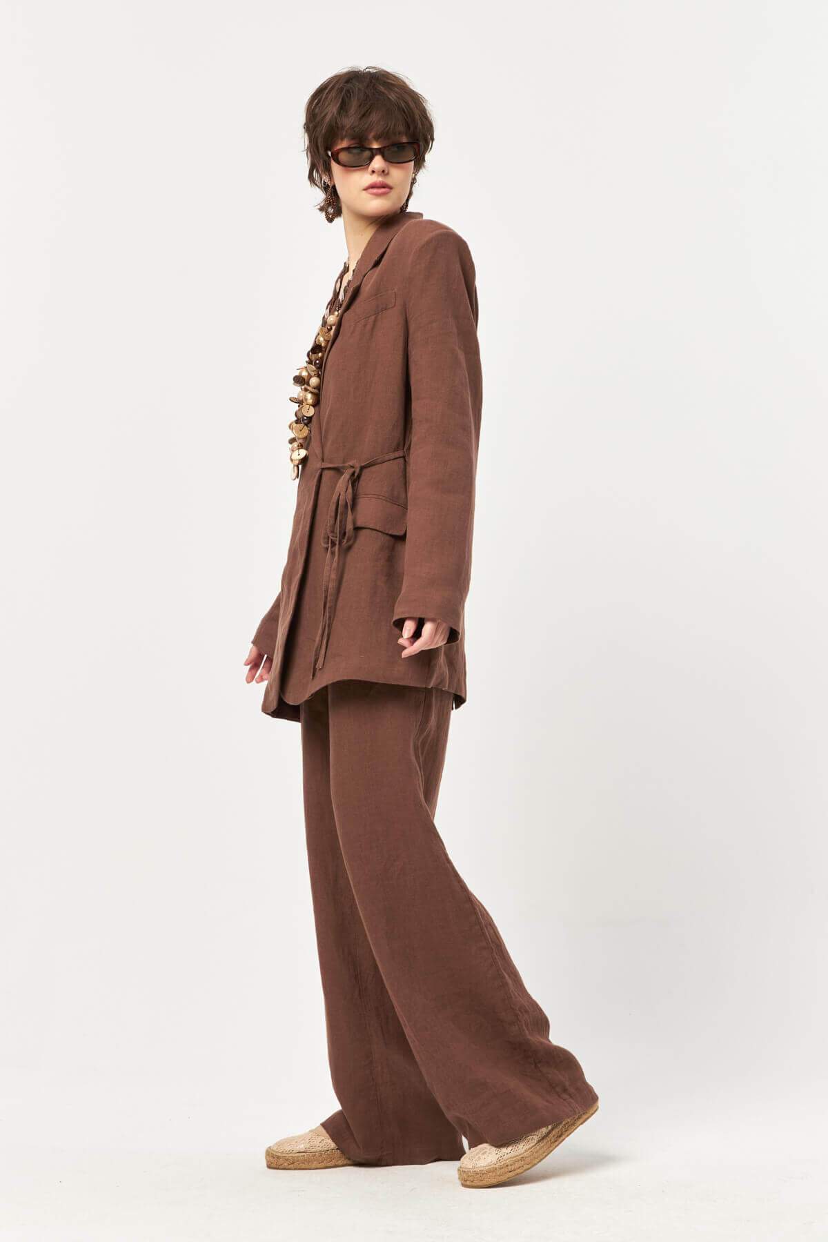 The deep cocoa-inspired shade enhances the natural texture of the linen fabric, creating a grounded yet refined look that feels timeless and versatile.