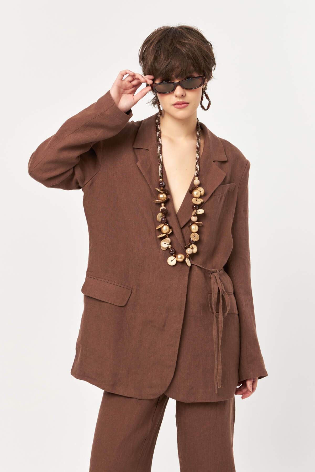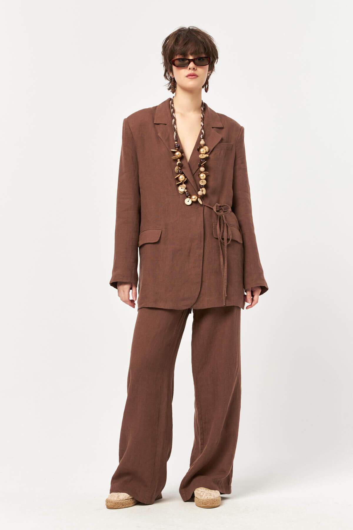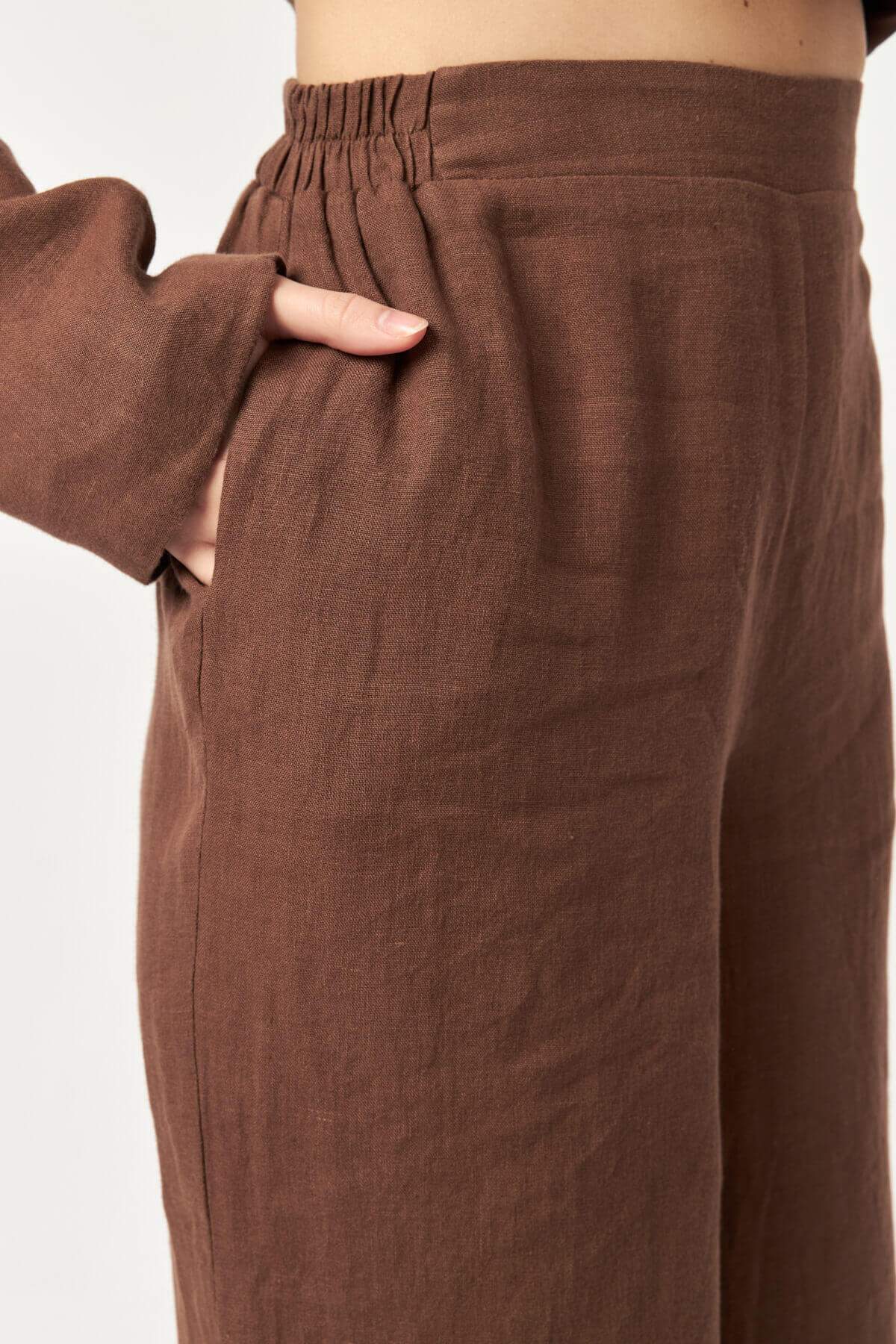 The deep cocoa-inspired shade enhances the natural texture of the linen fabric, creating a grounded yet refined look that feels timeless and versatile.