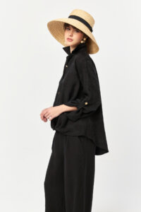 Cut in a fluid silhouette with a classic collar, the shirt is finished with gold-tone buttons for a polished contrast. A front twist detail shapes the drape naturally, allowing the piece to be worn styled or left loose for a more laid-back attitude. Lightweight at 140 GSM, it moves comfortably and transitions seamlessly from day to night.