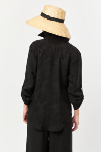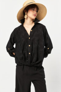 Designed in a tonal black jacquard with a subtle botanical texture, Noir Black Jacquard Twist Shirt offers a refined take on effortless dressing. The woven surface adds depth and quiet elegance, creating a look that feels elevated yet relaxed.