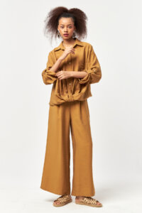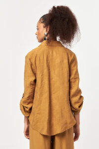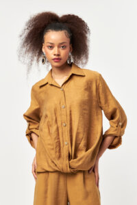 Featuring a relaxed fit with gold-tone buttons, the shirt is finished with a front twist detail that creates a fluid, sculpted drape. Lightweight and breathable, it delivers effortless comfort—perfect for transitional styling, layered looks, or refined everyday wear.