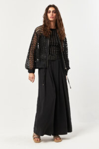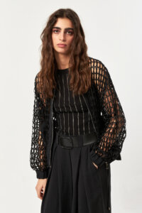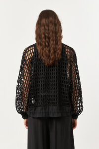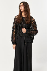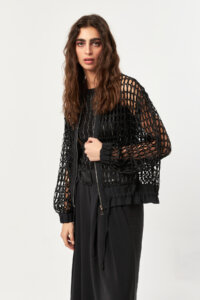 Designed with a bold open-mesh structure, the Open Mesh Bomber Jacket delivers a striking balance between texture and modern minimalism. The airy, net-like construction creates a lightweight and breathable feel, while the classic bomber silhouette and front zipper bring a contemporary edge. Finished in a clean black tone, this jacket is ideal for layering and adds depth to both casual and elevated looks.