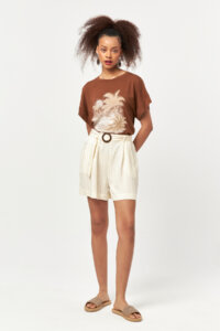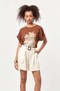 Designed with a relaxed silhouette, this brown short-sleeve T-shirt features a distinctive palm-inspired placement print that brings a soft tropical mood to everyday styling. Crafted from a breathable viscose-blend jersey, it offers a smooth touch and comfortable stretch, making it ideal for warm-weather wear. The earthy brown tone combined with the artistic front print creates a versatile piece that transitions effortlessly from casual daytime looks to laid-back summer evenings.