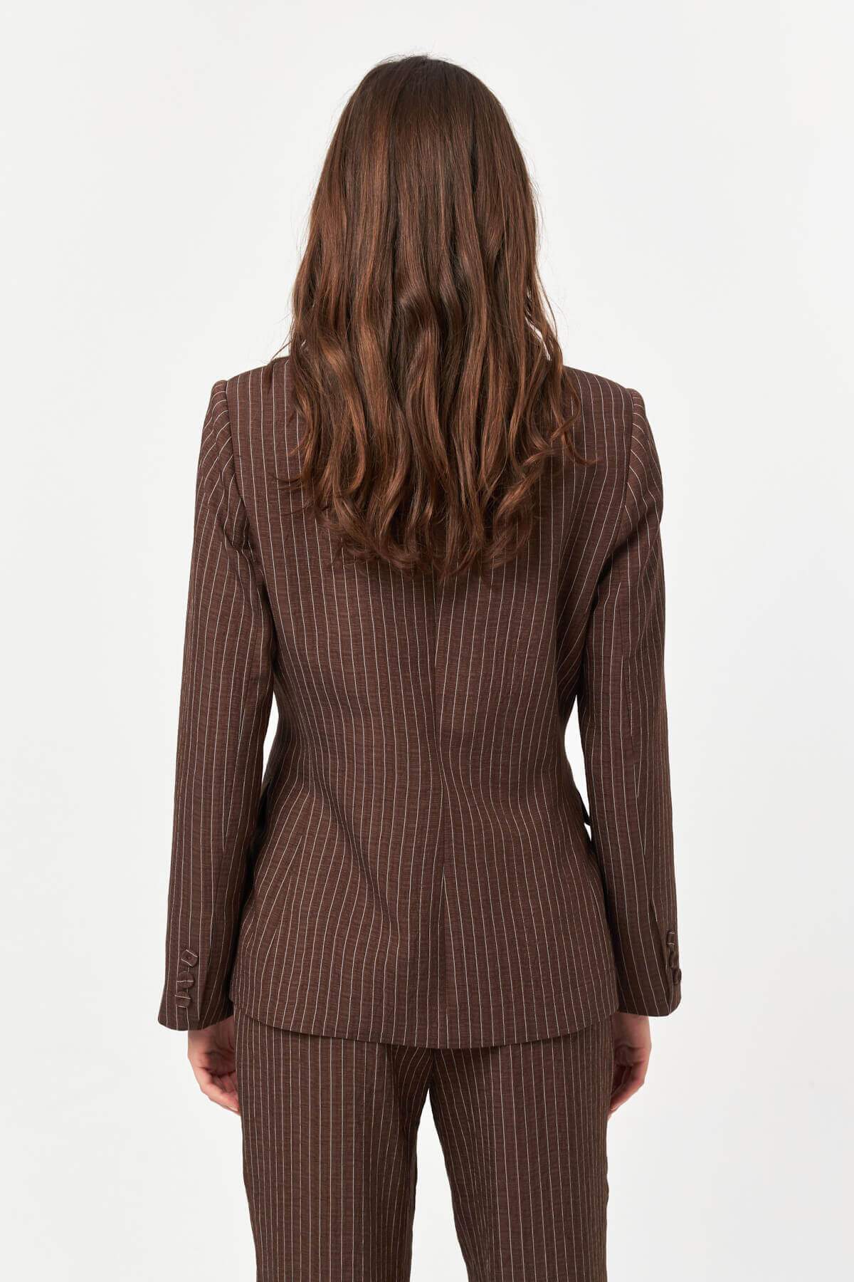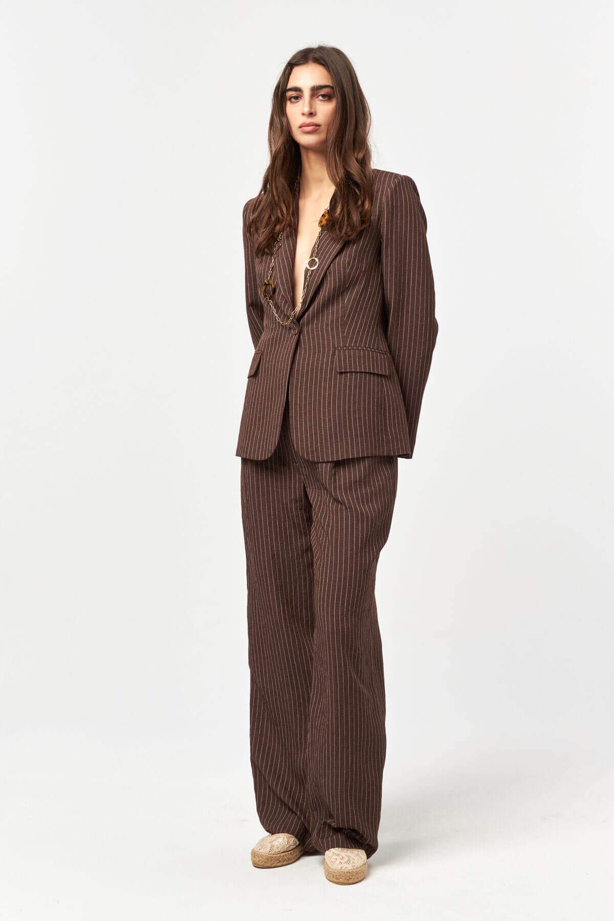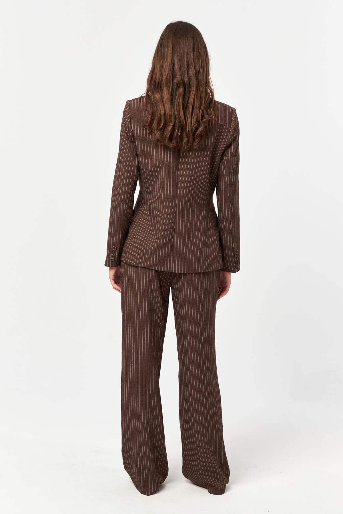 Designed with a sharp yet fluid approach to tailoring, the Pinstripe Tailored Suit redefines classic suiting through a modern, feminine lens. The elongated pinstripe pattern enhances the silhouette, creating a confident, refined look with a contemporary edge.