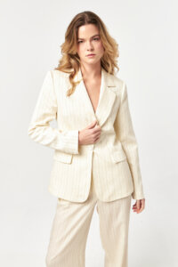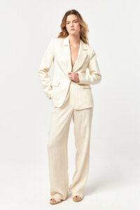 The Ecru–Camel pinstripe brings a soft yet distinctive elegance to the tailored silhouette, blending light ecru tones with warm camel stripes for a refined, natural contrast. This subtle colour pairing enhances the clean lines of the suit while highlighting the fluid texture of the fabric.