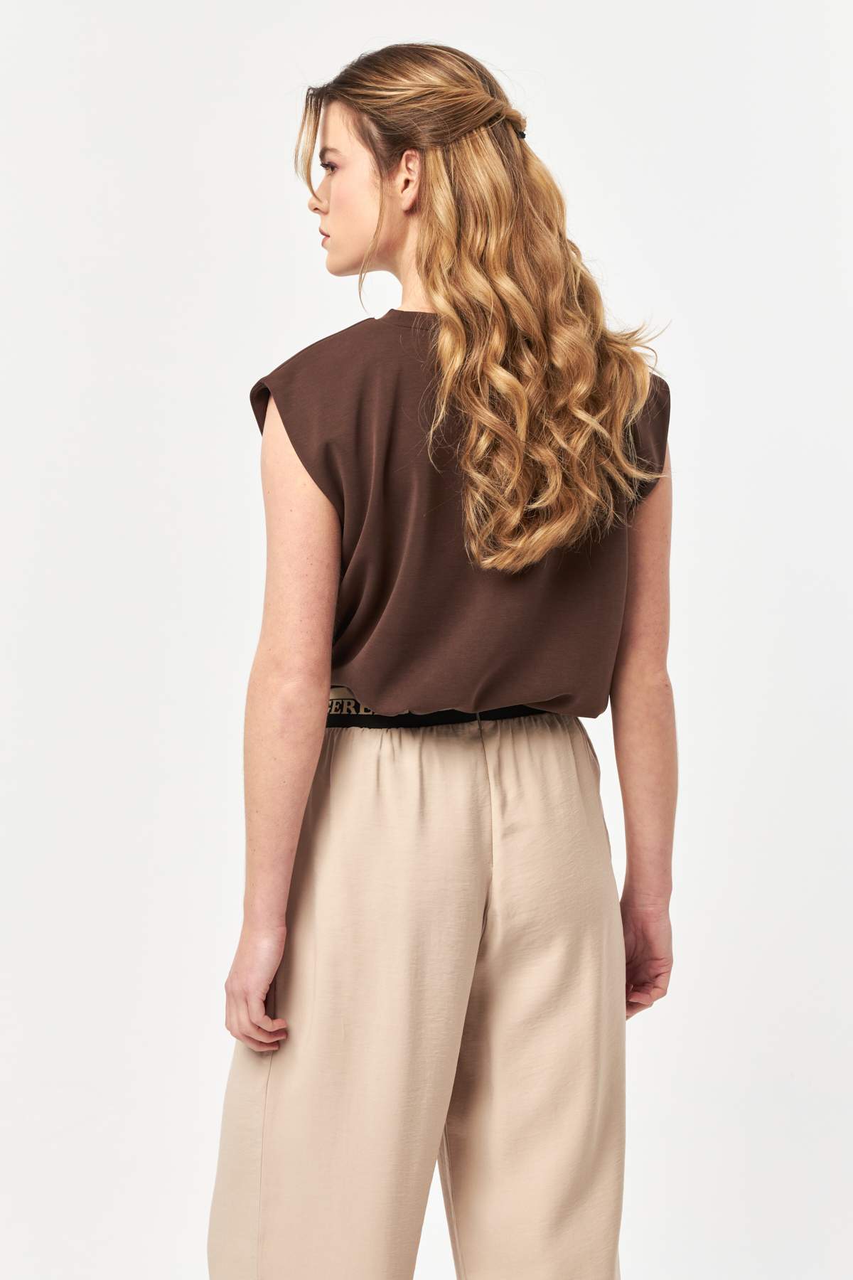 - Sleeveless silhouette with structured shoulder detail