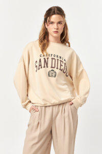 The beige tone enhances the sweatshirt’s understated character, allowing it to pair easily with both matching bottoms and casual denim. A versatile piece that transitions seamlessly from at-home comfort to off-duty city styling.