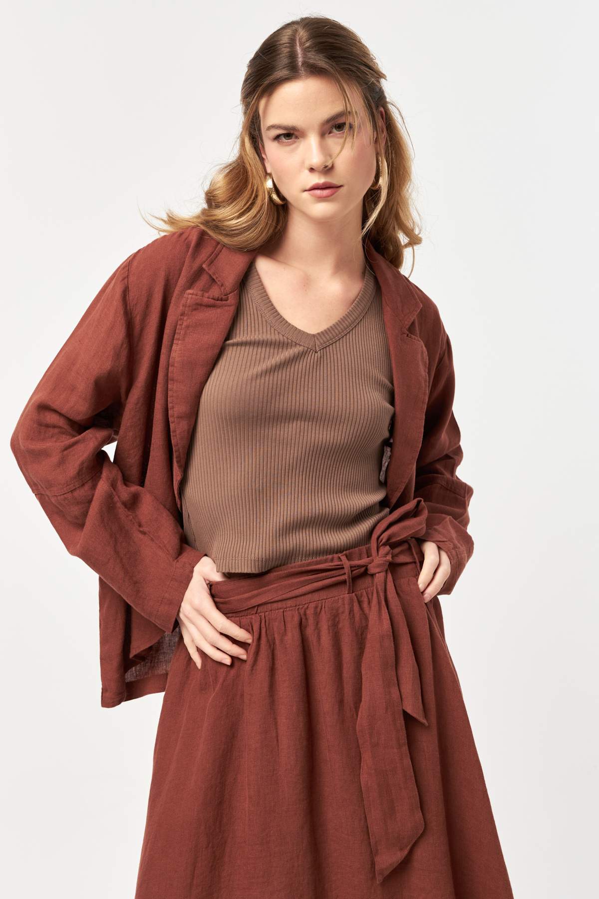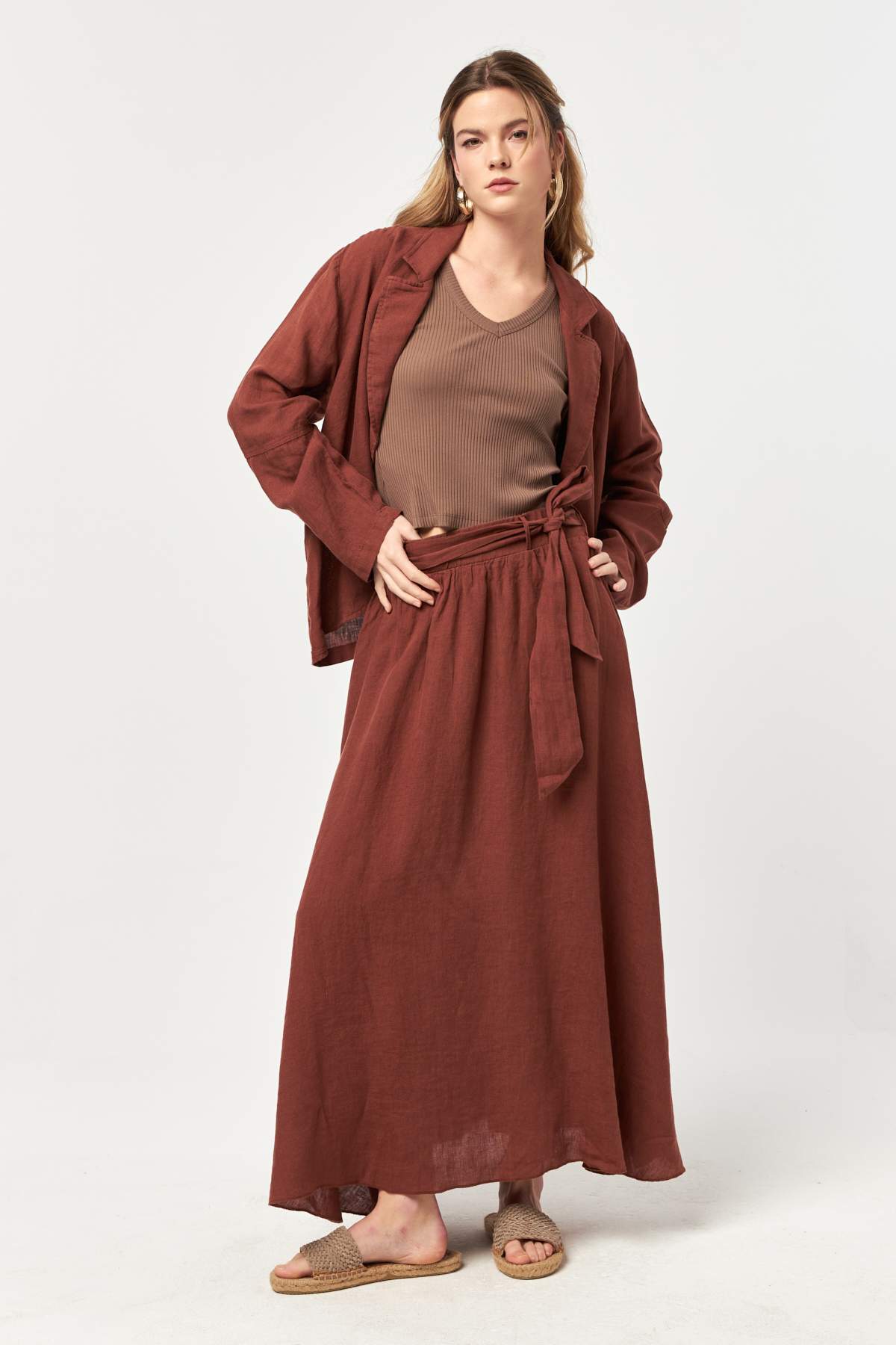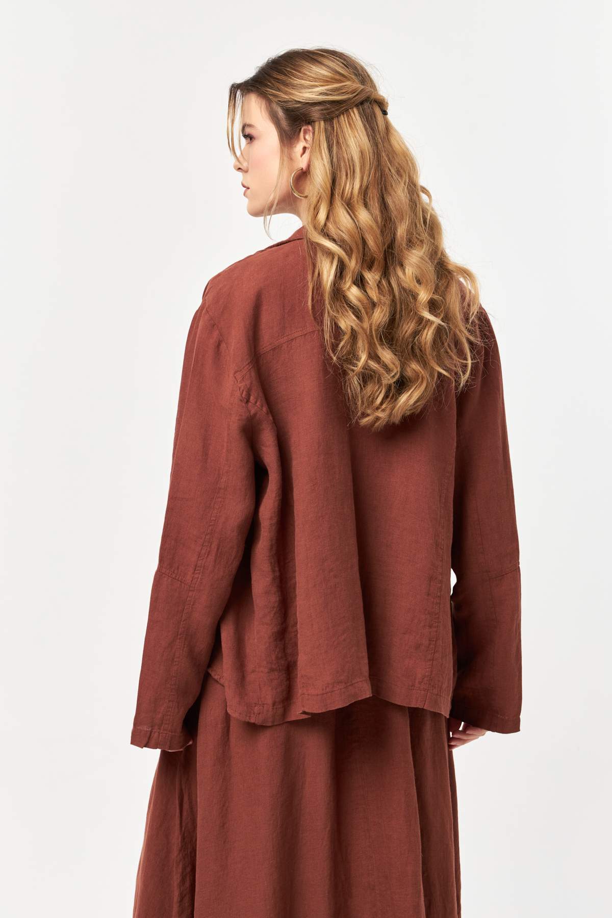 Warm and softly grounded, the Croquant tone brings depth and character to the natural linen texture. The relaxed silhouette and open-front design create an easy layering piece with a confident, sun-washed summer feel.