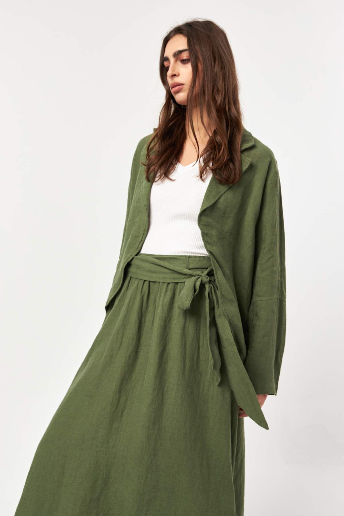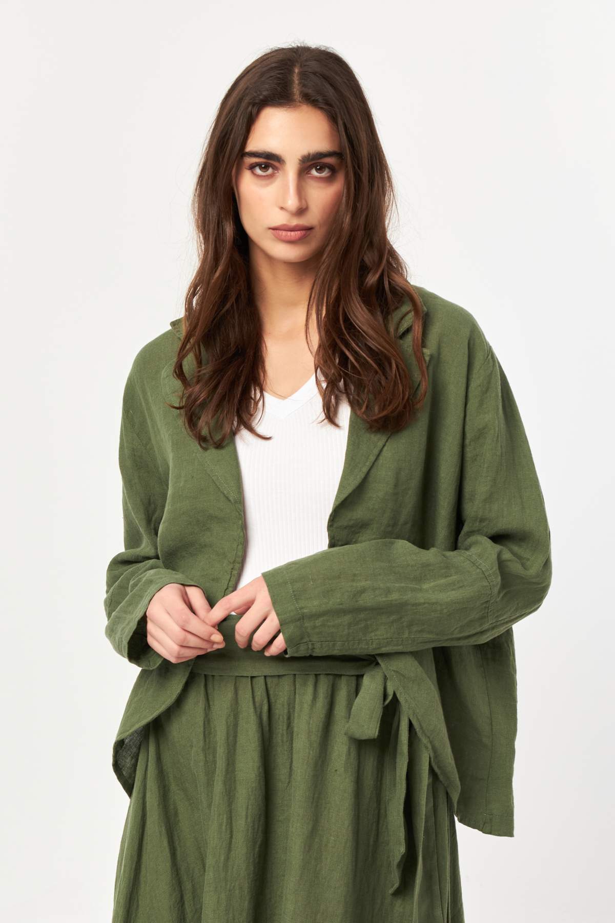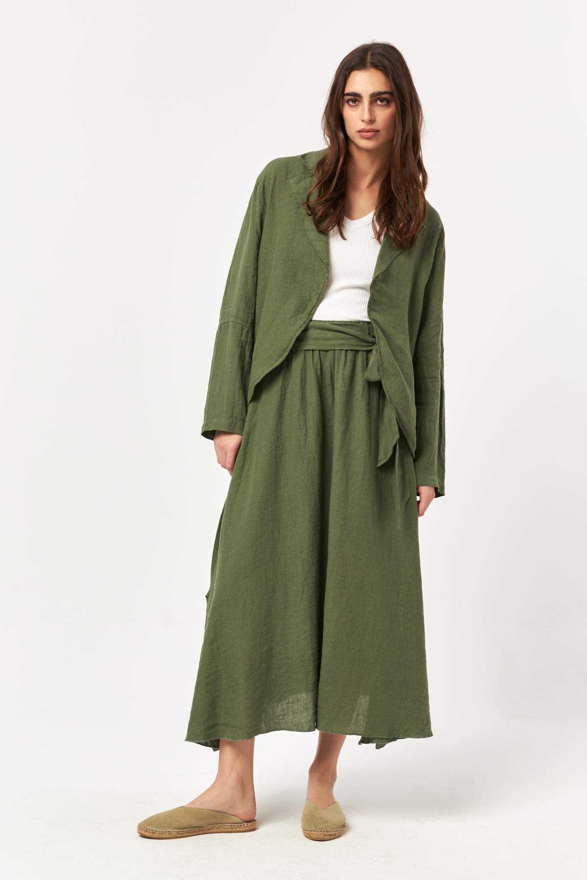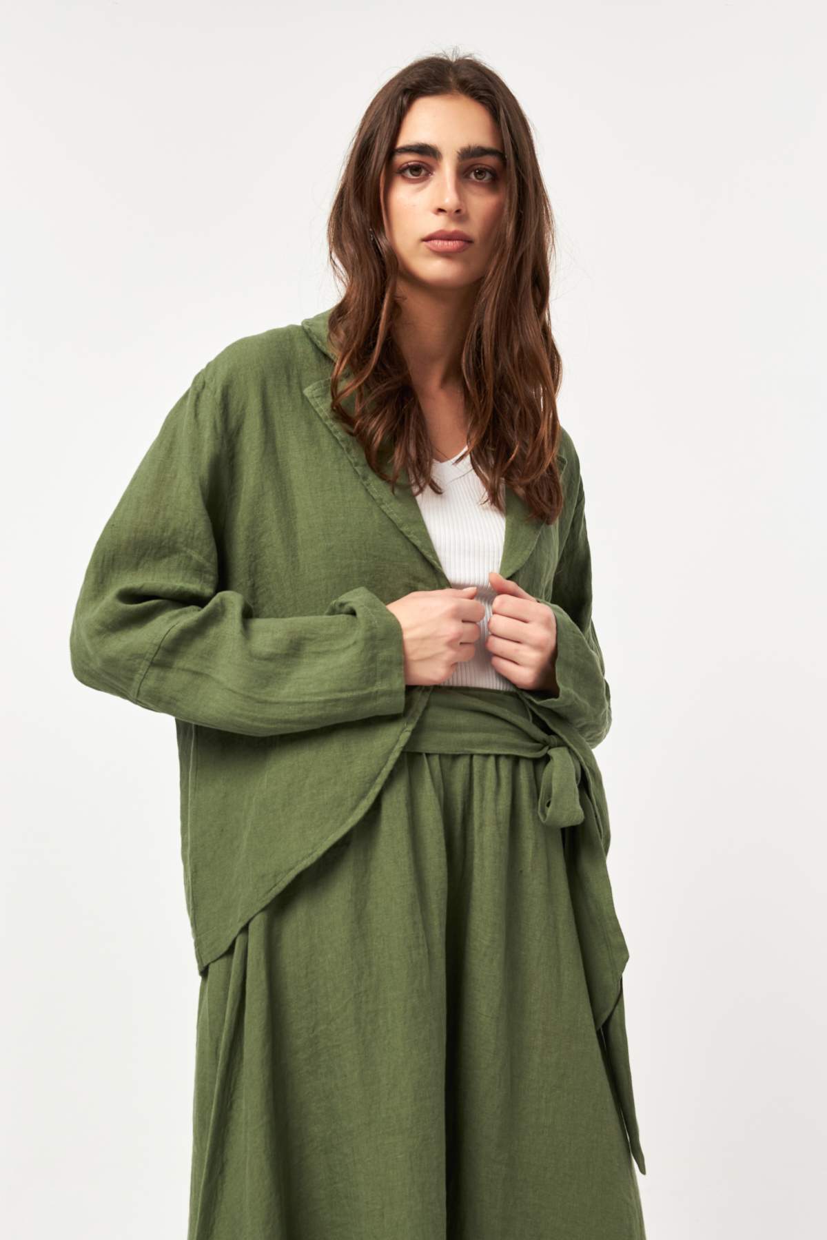 Natural and grounded, the Khaki tone highlights the organic texture of linen with a timeless, earthy character. The relaxed silhouette and open-front design make this jacket an effortless layering piece for everyday summer styling.