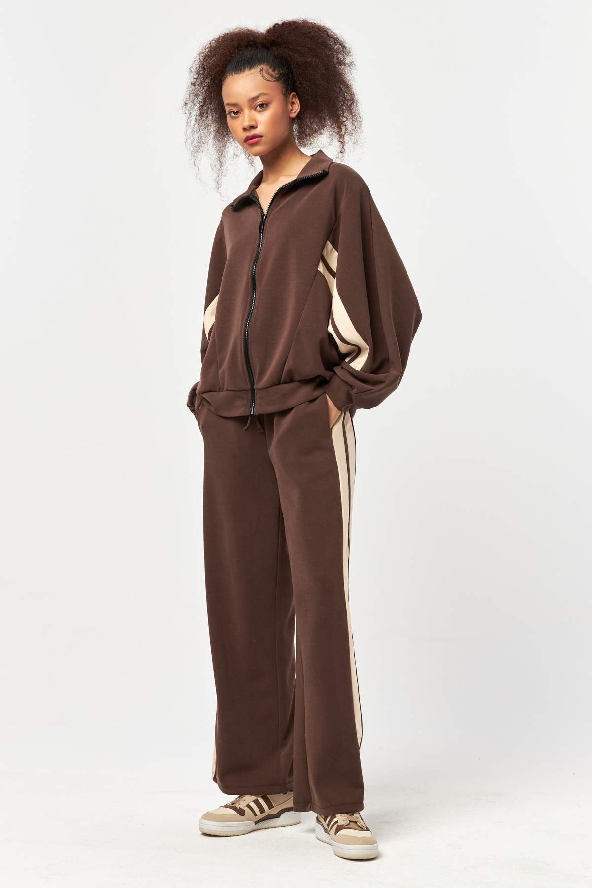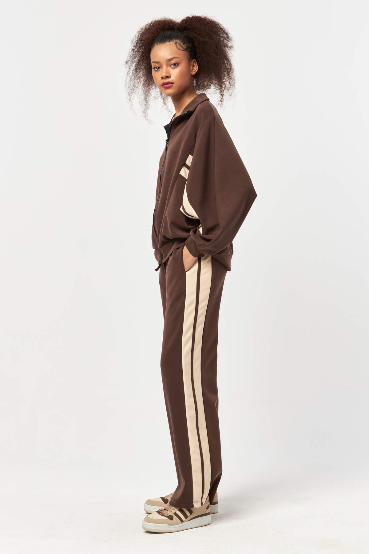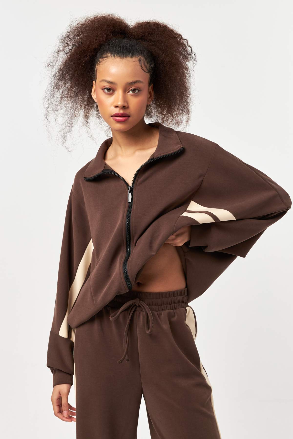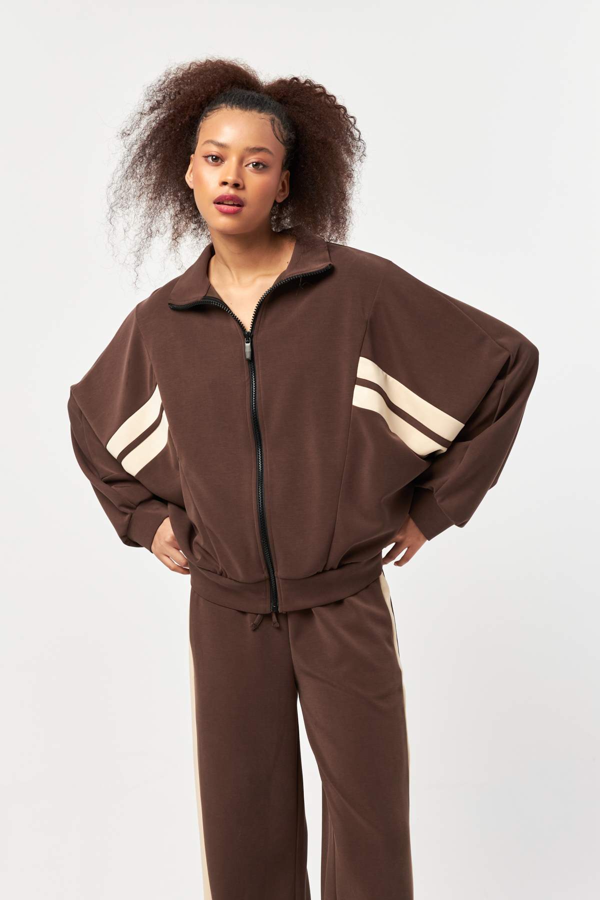 The zip-up jacket features a relaxed fit and subtle contrast stripe detailing on the sleeves, adding a dynamic athleisure touch.