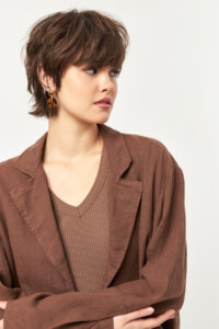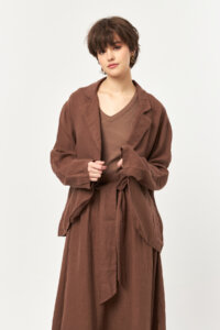 Designed as a lightweight outer layer, this linen jacket features a soft tailored silhouette with a classic lapel collar and an open-front design. The warm Nesquik tone enhances the natural texture of linen, making it an effortless layering piece for summer days and transitional evenings.