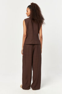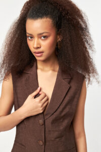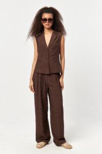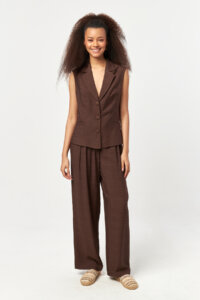 The Bitter colourway brings a deeper, more expressive character to the sleeveless tailored silhouette, emphasizing the fabric’s natural texture and refined structure. This rich, grounded tone adds strength to the clean lines of the design while maintaining a soft, fluid drape.