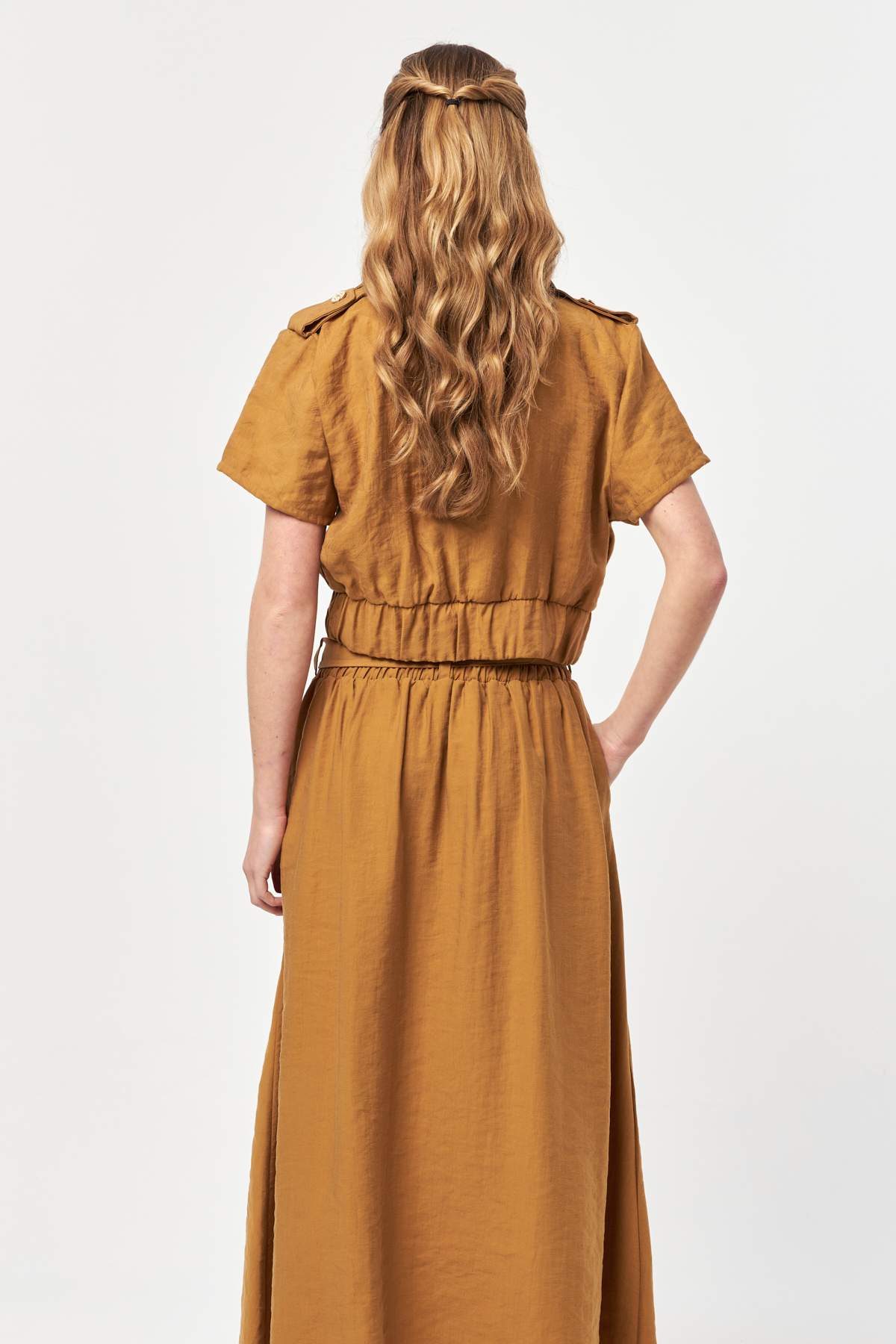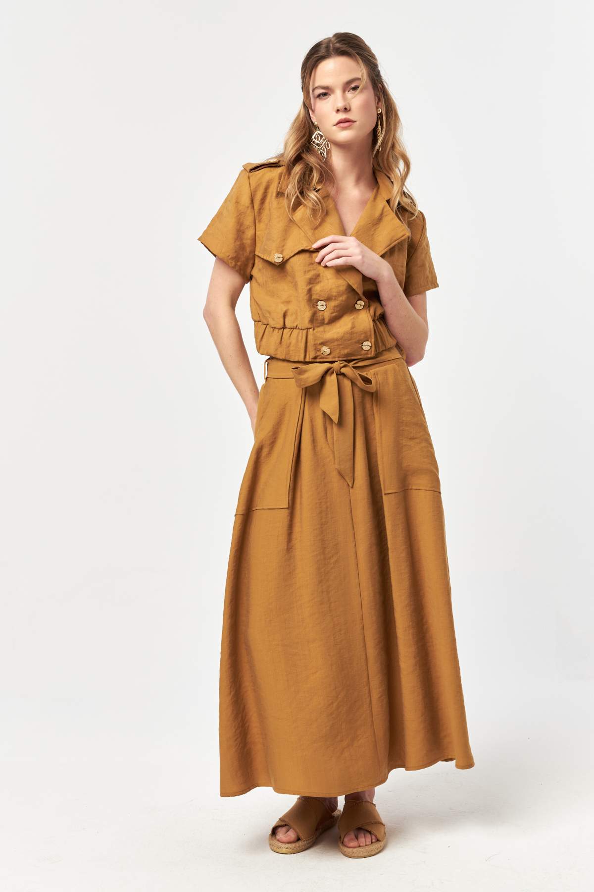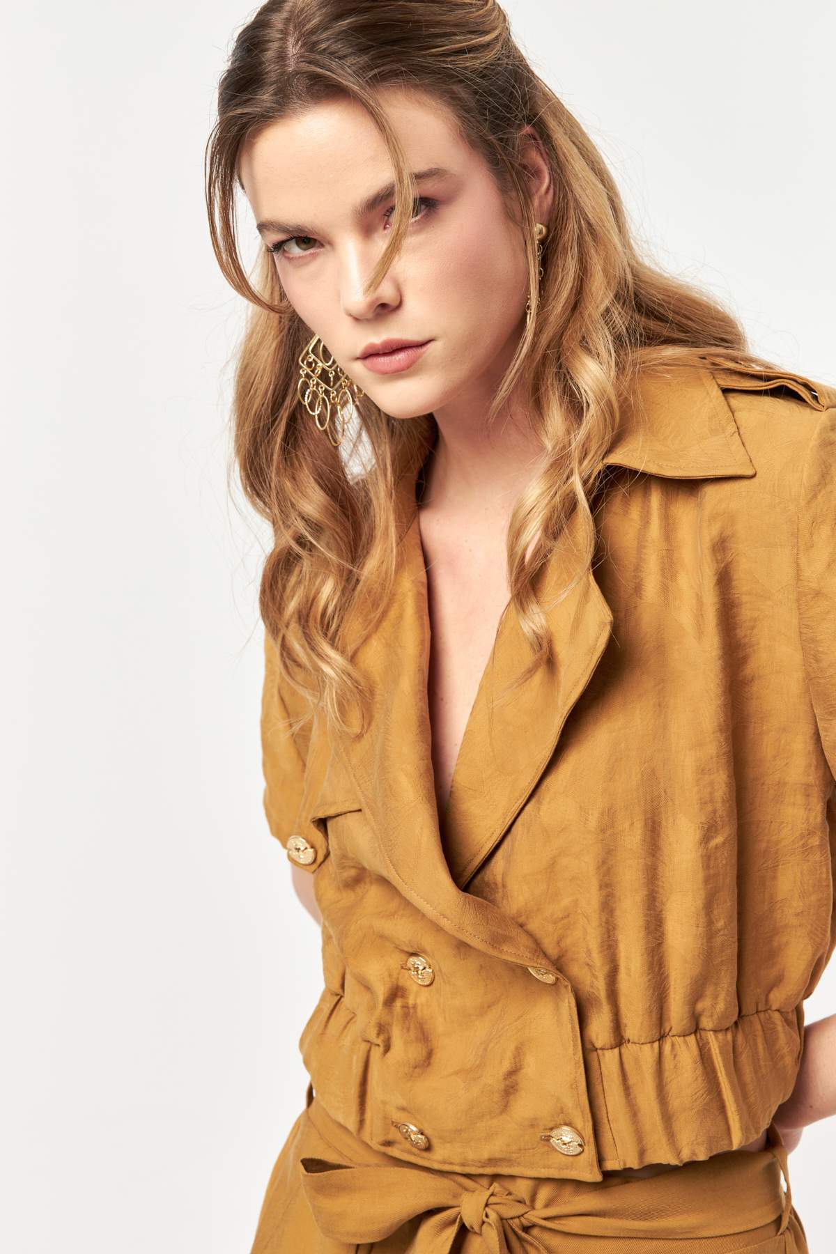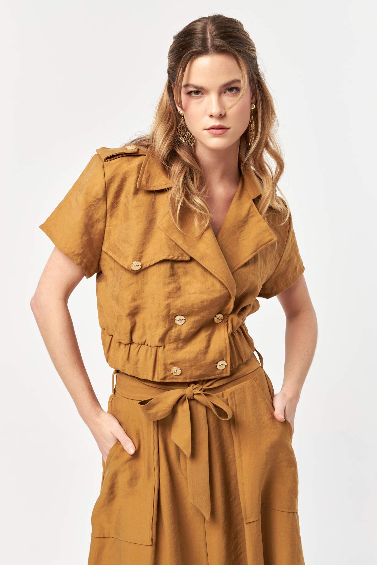 Cut in a cropped silhouette with a gently structured form, the jacket features a double-breasted front with tonal buttons for a clean, cohesive finish. Short sleeves and a lightly elasticated hem create a balanced fit that sits comfortably at the waist. Lightweight and breathable, it’s ideal for coordinated sets, transitional styling, and elevated everyday wear.
