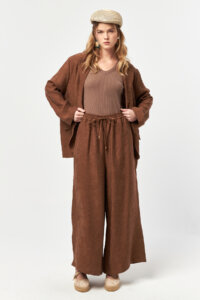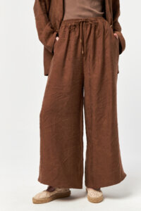 Featuring an elasticated waistband with adjustable drawstring, the pants offer a comfortable, flexible fit while allowing easy styling at the waist. The wide-leg cut creates a fluid line, enhancing movement and airiness throughout the day. Side pockets add functional ease, making this piece ideal for both casual wear and coordinated set styling.