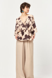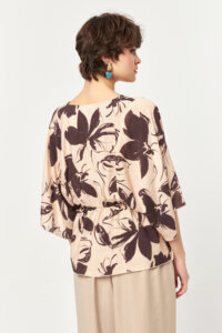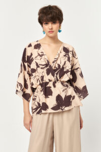 Designed with a relaxed wrap-style silhouette, this blouse features a flattering V-neckline and a softly elasticated waist that gently defines the figure without compromising comfort. Crafted from a lightweight modal-blend fabric, it offers a breathable feel and fluid drape, making it ideal for warm-weather wear. The expressive floral print in beige and bitter tones brings a refined yet artistic character, perfect for both coordinated sets and effortless everyday styling.