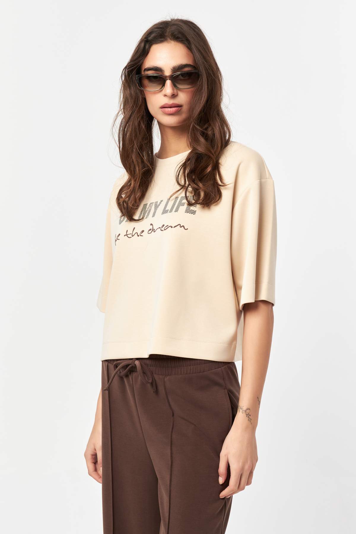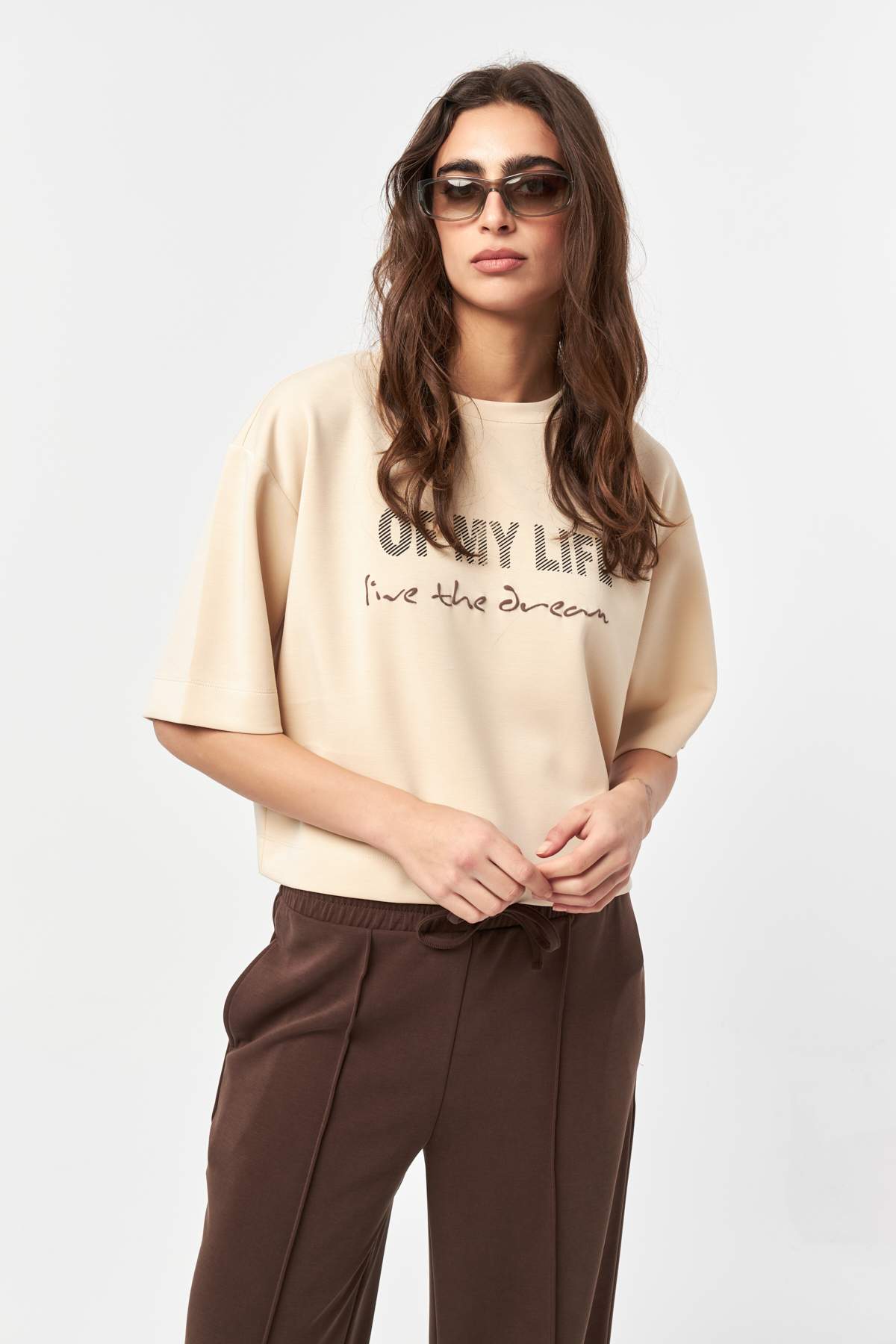 Crafted from a smooth modal-blend fabric, the silhouette drapes naturally on the body, providing lightweight comfort and ease of movement throughout the day. Its minimal design and refined placement print add a subtle statement while maintaining a calm, wearable aesthetic. Ideal for pairing with relaxed trousers, denim, or matching sets, this t-shirt is a versatile essential for off-duty styling.