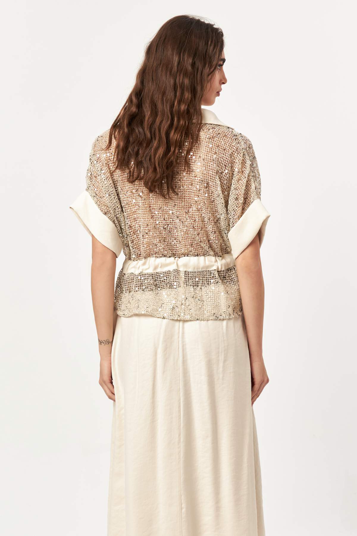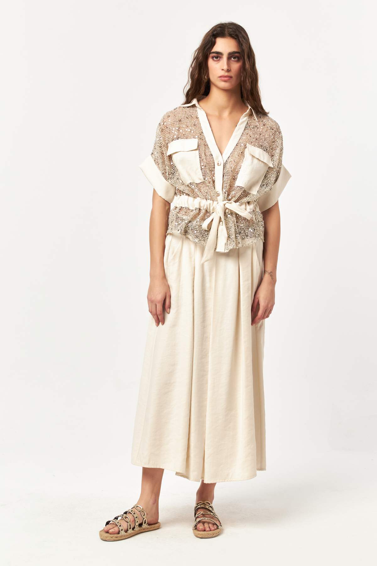 Designed with a fluid, mid-length silhouette, this stone-colored skirt features a softly structured waistband enhanced by a removable belt detail for a defined yet relaxed fit. Crafted from a lightweight modal-blend fabric, it offers a smooth, breathable feel with elegant movement. The subtle sheen and flowing pleats create a refined balance between comfort and sophistication, making it ideal for both everyday styling and elevated looks.