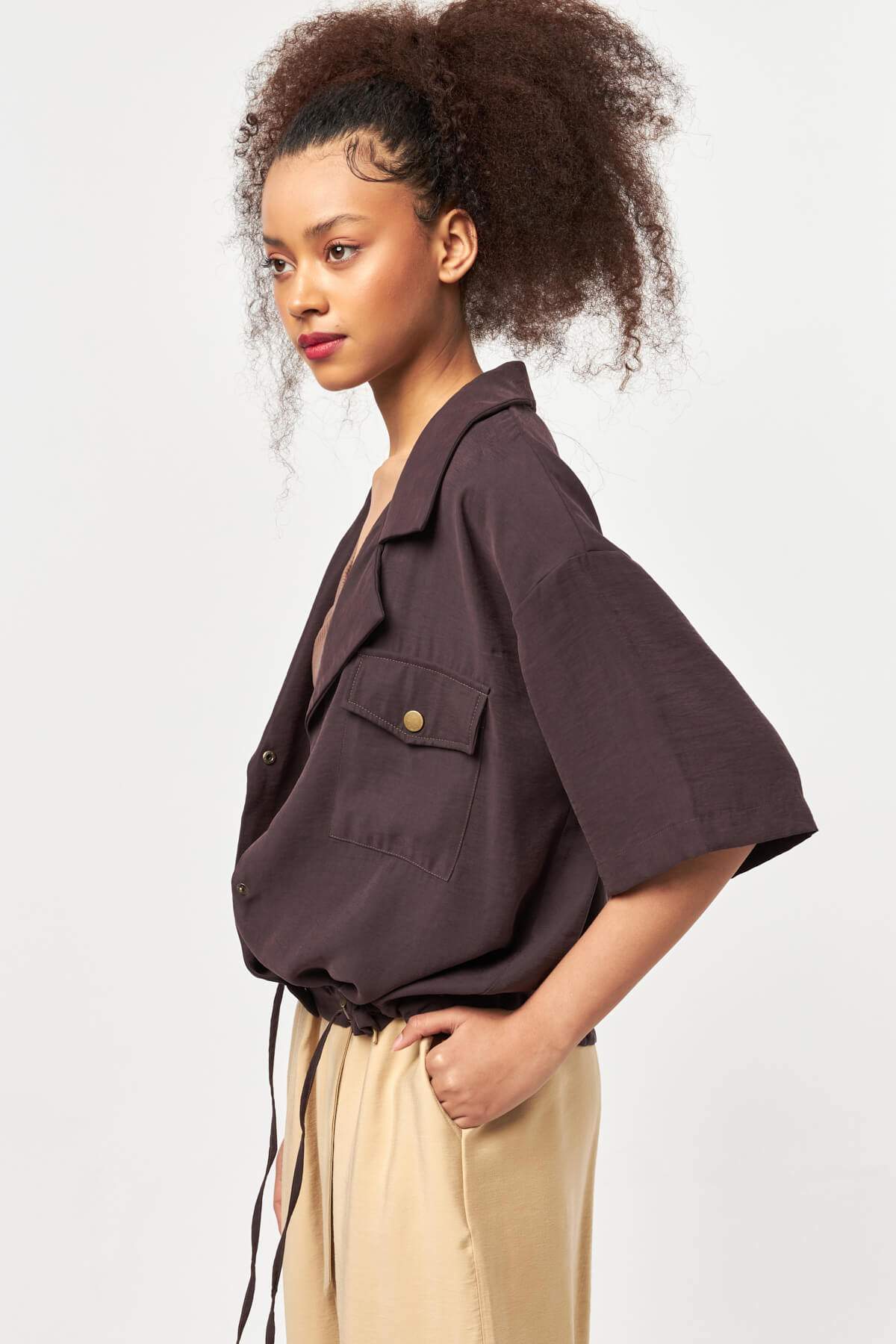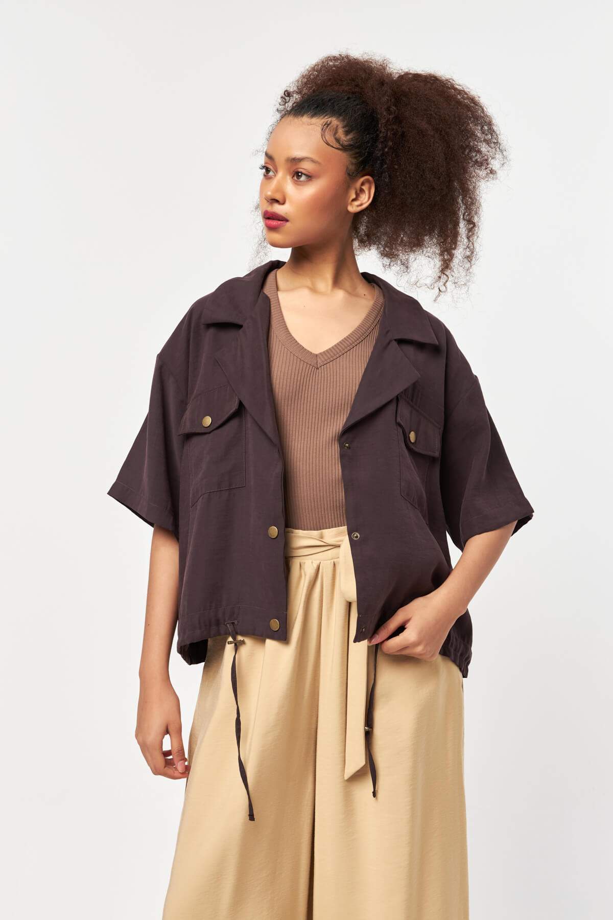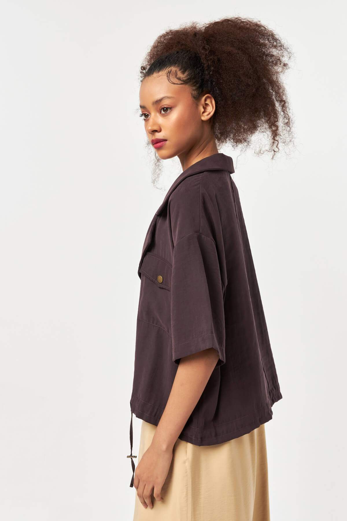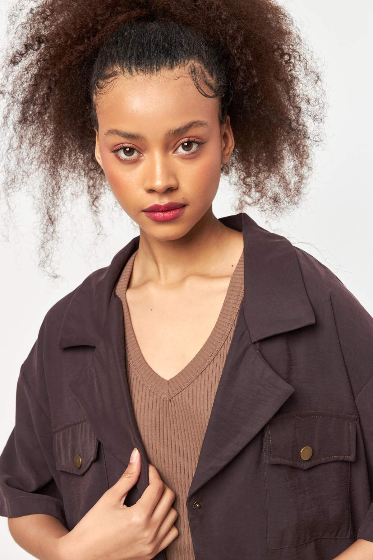 Designed with a relaxed silhouette and a soft utility attitude, the Soft Utility Bitter Short Sleeve Jacket combines comfort with a confident, modern edge. Crafted from a lightweight modal-blend fabric, this short-sleeve jacket offers a fluid drape and breathable feel, making it ideal for warm-weather layering. Finished in a deep Bitter tone, it delivers a stronger, more defined look that elevates everyday styling.