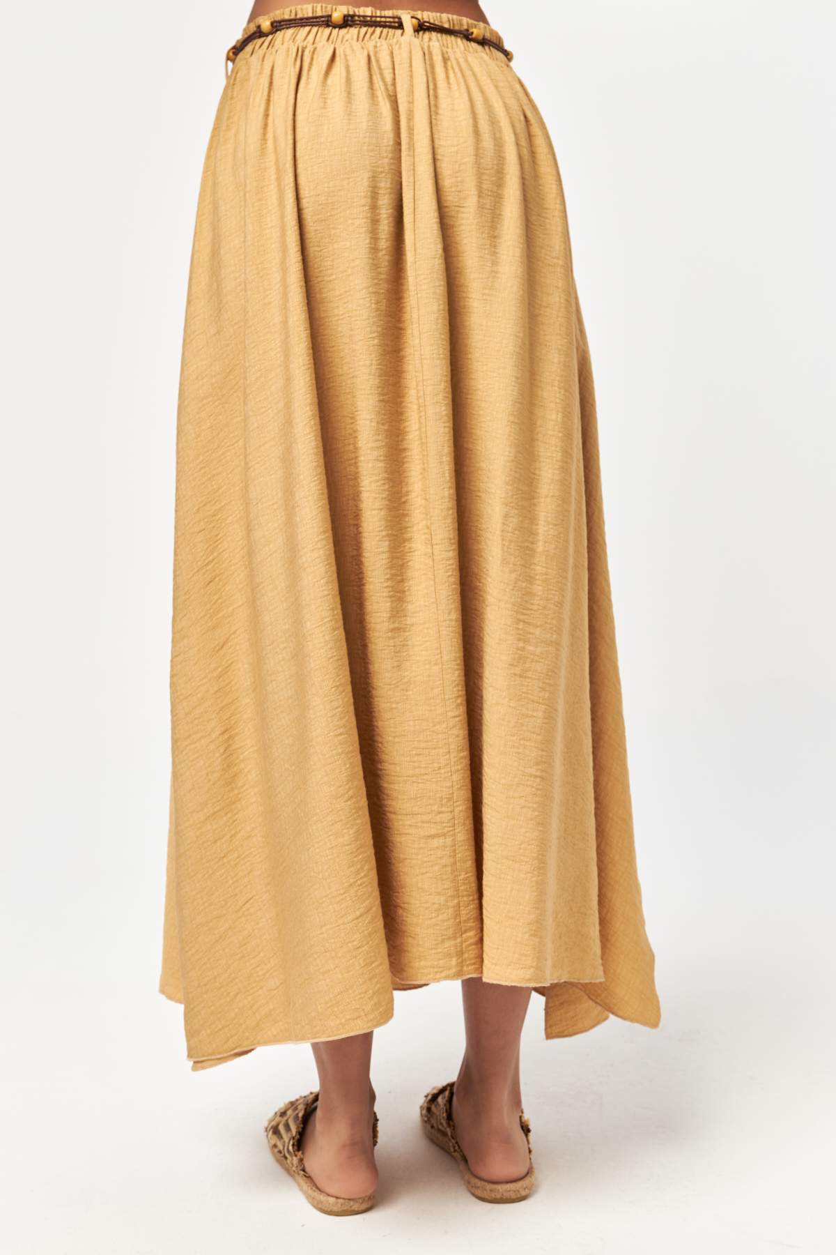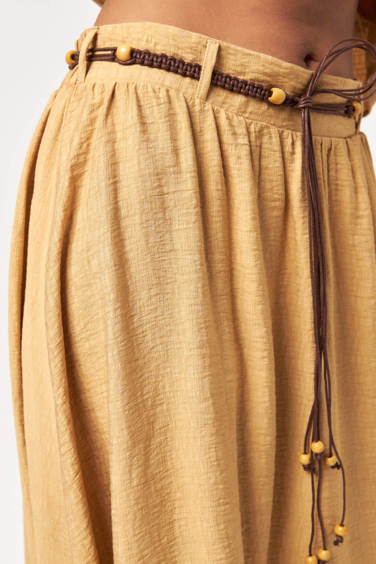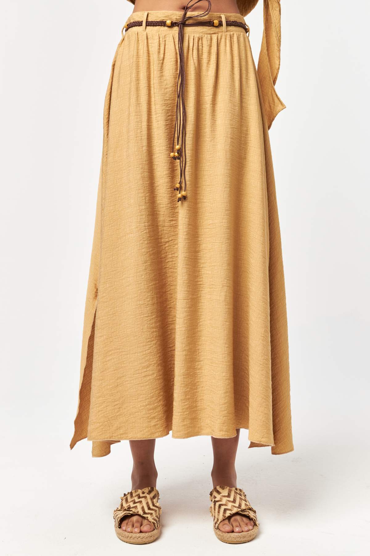 The Solace Beige Fluid Long Skirt is defined by its soft, natural tone and elongated, flowing silhouette. Crafted from a lightweight woven fabric, the design features a comfortable elasticated waistband with an adjustable drawstring detail, allowing effortless movement throughout the day. Subtle side slits add ease and fluidity, making this piece a refined yet relaxed choice for warm-weather styling.