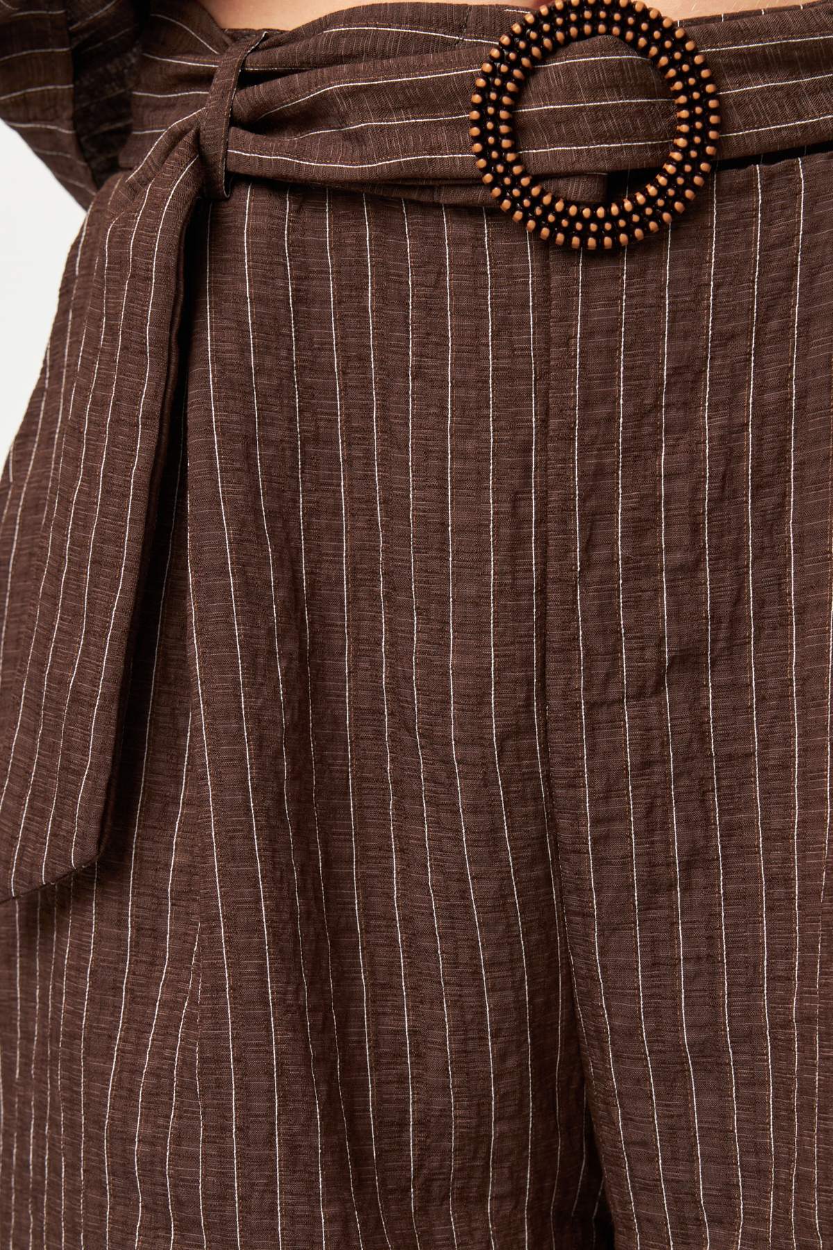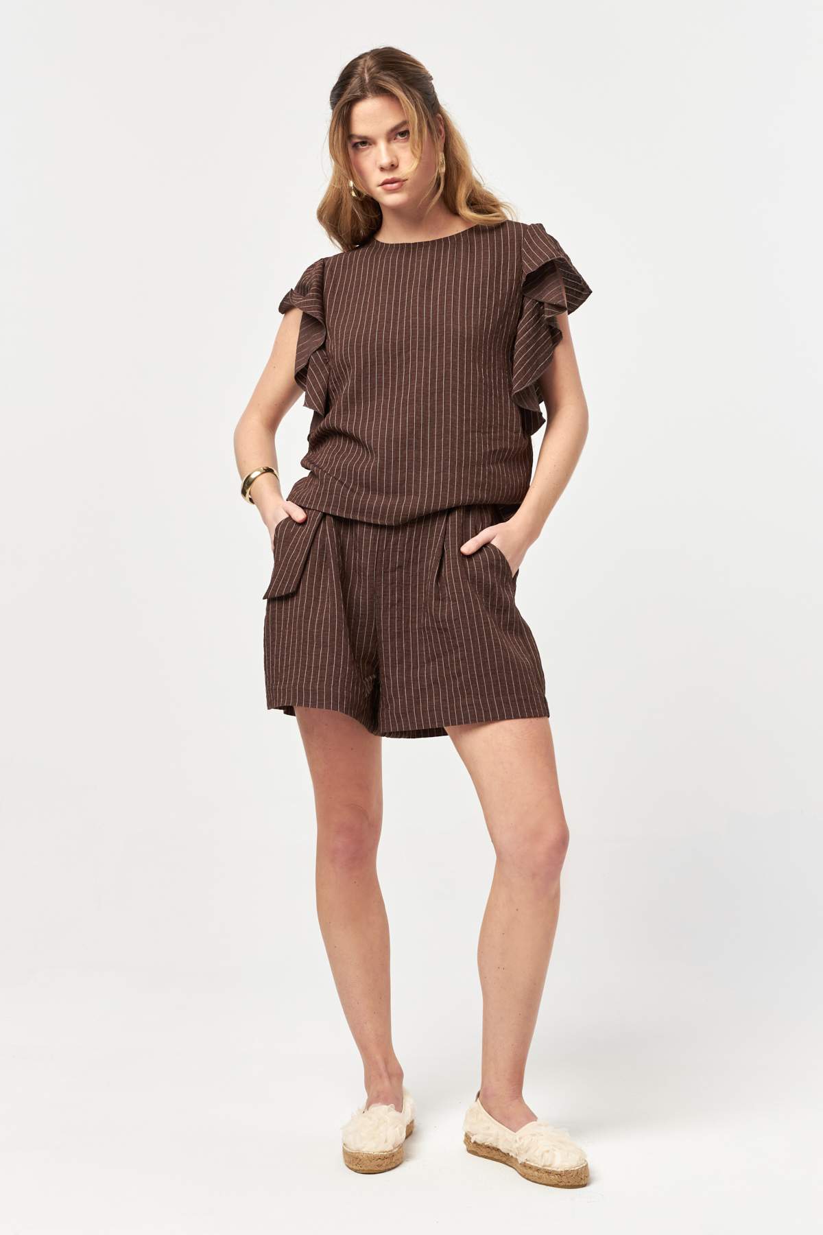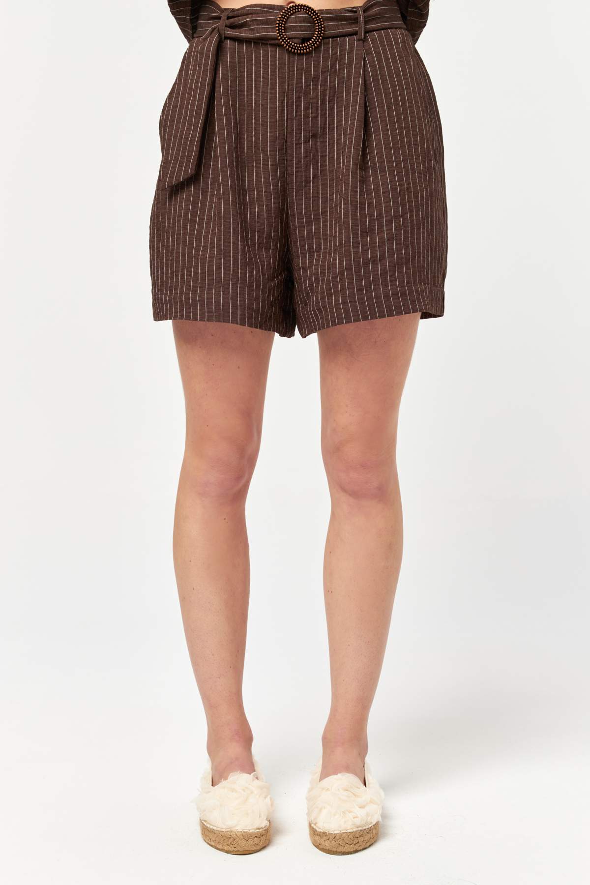 The Solace Belted Shorts in Bitter Stripe offer a relaxed yet refined silhouette designed for effortless summer styling. Crafted from a lightweight woven fabric, these high-waisted shorts feature a softly structured fit that allows ease of movement throughout the day. The adjustable self-fabric belt with a decorative buckle detail adds definition at the waist, while the vertical stripe pattern enhances a clean, elongated look. Finished with functional side pockets, the design balances comfort and practicality with a natural, understated elegance. The deep Bitter tone paired with subtle stripes makes these shorts easy to style with matching tops or simple basics for casual, resort, and everyday wear.