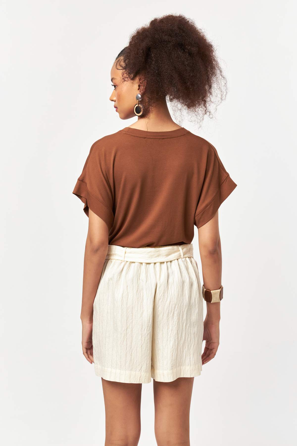 The Solace Belted Shorts in Ecru–Camel Stripe offer a fresh and effortless take on summer dressing with a softly structured silhouette. Crafted from a lightweight woven fabric, these high-waisted shorts provide a relaxed fit that ensures comfort throughout the day. The adjustable self-fabric belt with a decorative buckle detail adds gentle waist definition, while the vertical stripe pattern creates a clean, elongated appearance. Finished with functional side pockets and subtle front pleats, the design balances practicality with understated elegance. The Ecru–Camel stripe combination brings a light, natural feel that pairs easily with matching tops or neutral essentials for casual, resort, and everyday looks.