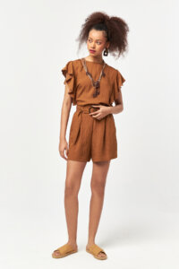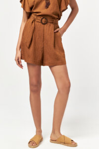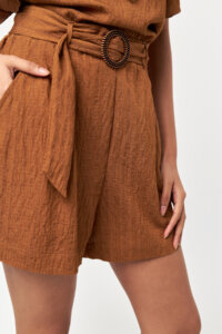 The Solace Belted Shorts in Snuff bring a warm, natural tone to a relaxed yet refined summer silhouette. Crafted from a lightweight woven fabric, these high-waisted shorts offer a soft structure that allows comfortable movement throughout the day. The adjustable self-fabric belt with a decorative buckle detail gently defines the waist, while the clean front pleats add subtle volume and ease. Designed with functional side pockets, the shorts combine practicality with effortless style. The earthy Snuff shade creates a versatile look that pairs seamlessly with matching tops or simple neutrals, making it ideal for casual, resort, and everyday wear.