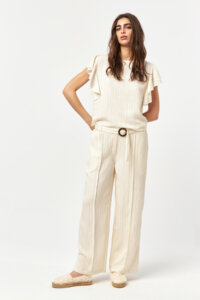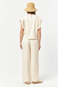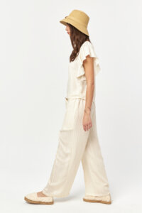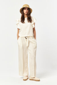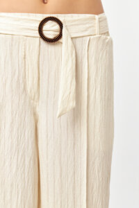 The Solace Ecru-Camel Stripe Pants offer a light, natural look defined by soft contrast stripes and a fluid silhouette. Crafted from a lightweight woven fabric, the relaxed form allows effortless movement, while the vertical stripe pattern adds a refined, elongated effect. Designed for easy summer dressing, this piece combines comfort with understated elegance.