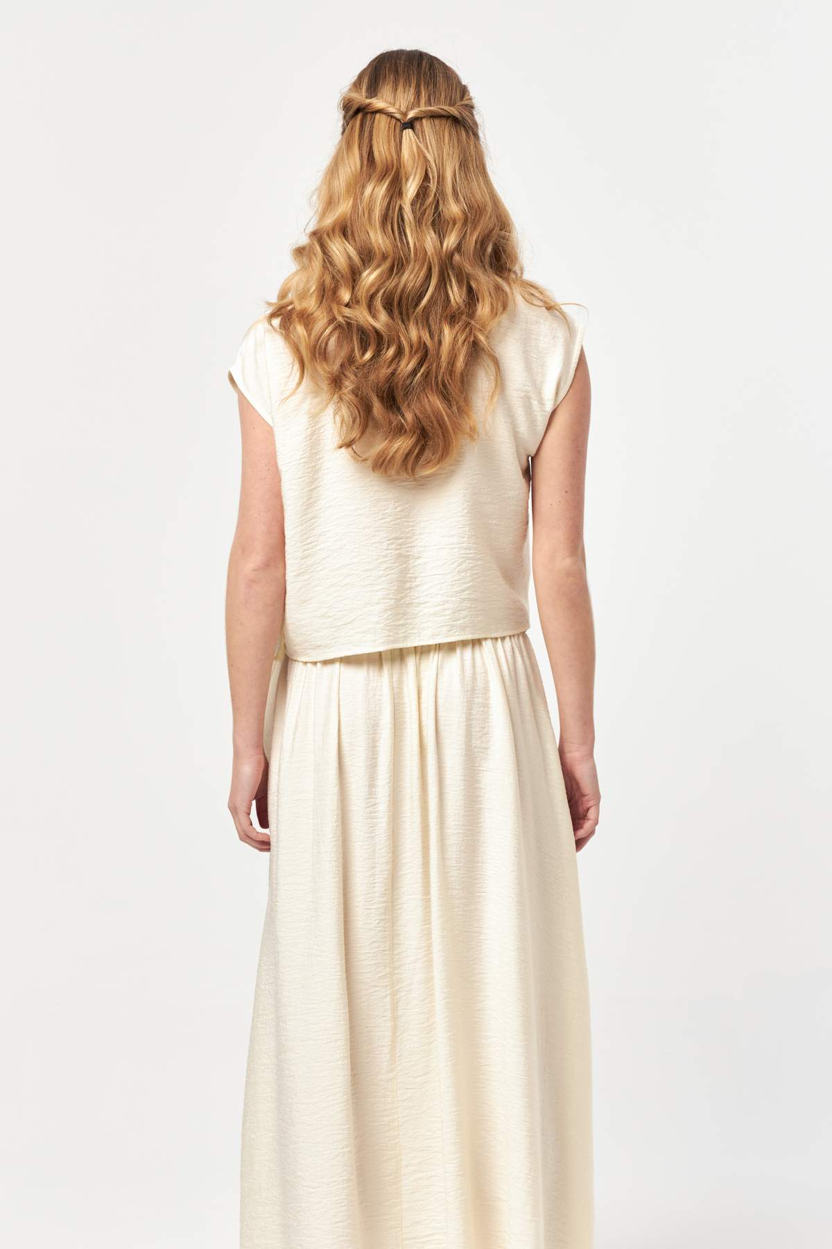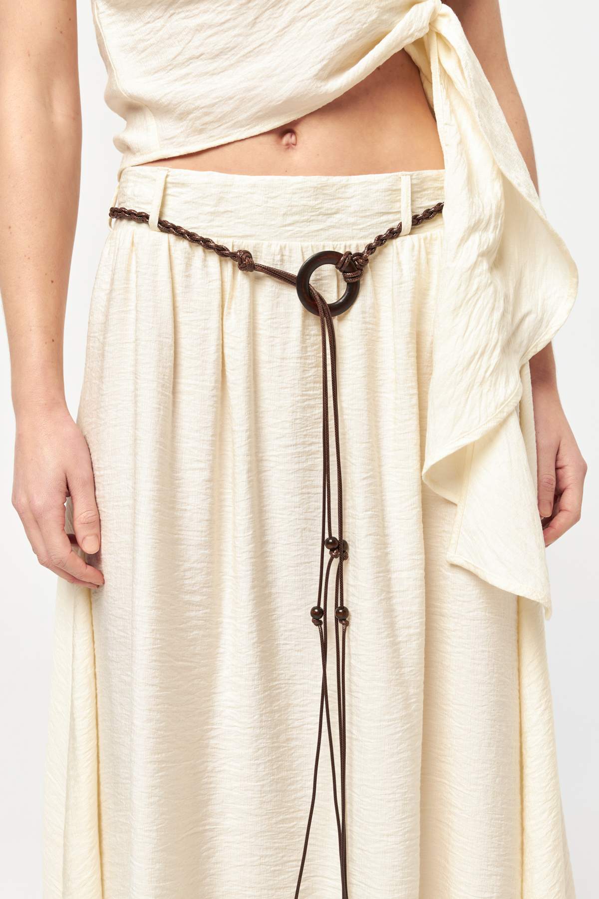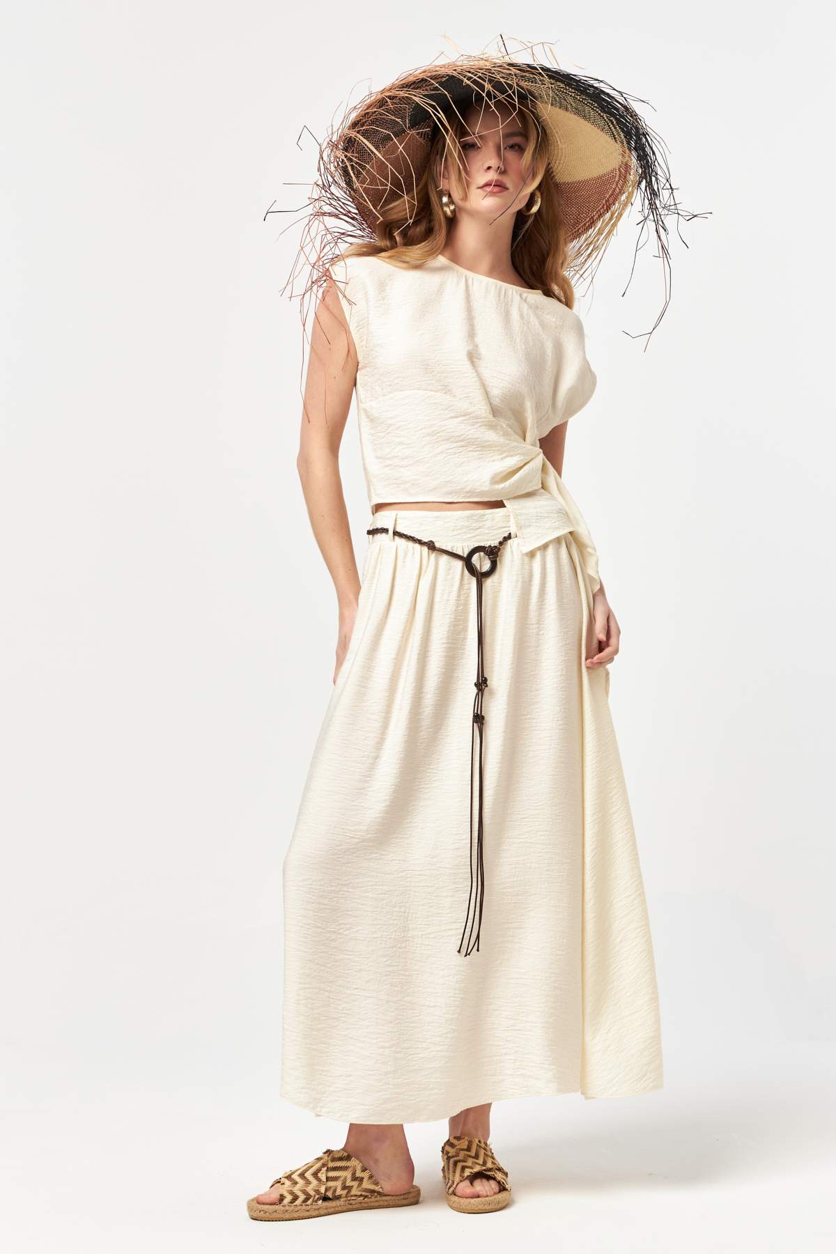 The Solace Ecru Fluid Long Skirt offers a relaxed, elongated silhouette defined by effortless movement and soft drape. Crafted from a lightweight woven fabric, the design features an elasticated waistband with an adjustable drawstring detail for all-day comfort and ease. A refined summer essential that brings fluidity and understated elegance to everyday styling.