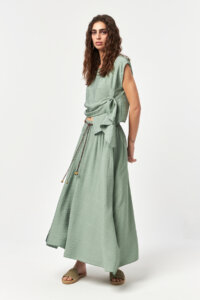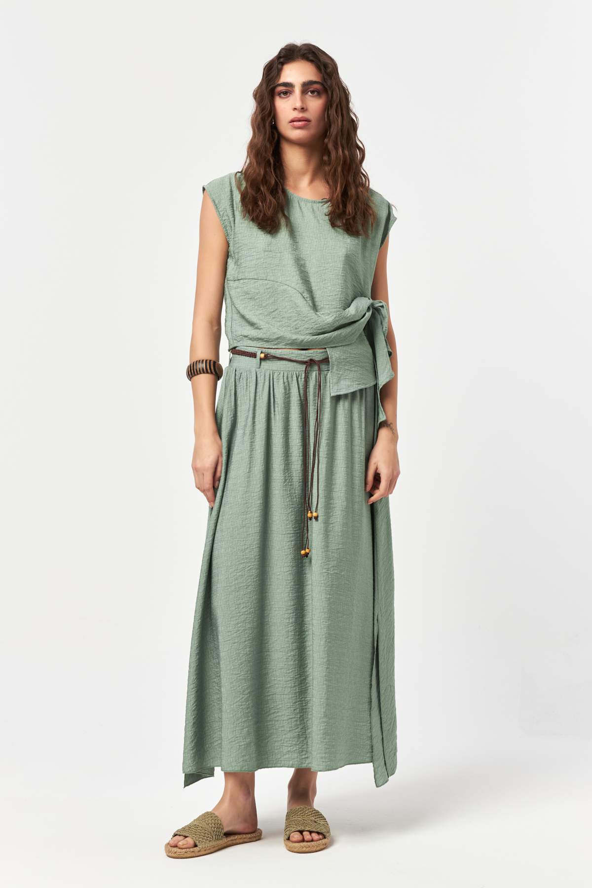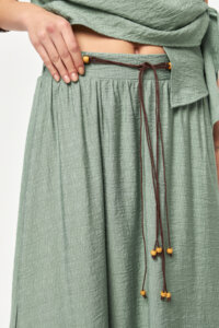 The Solace Mold Powder Fluid Long Skirt is defined by its soft, muted tone and elegantly elongated silhouette. Crafted from a lightweight woven fabric, the design features a comfortable elasticated waistband with an adjustable drawstring detail for effortless wear. Subtle side slits add natural movement, making this piece a calm, refined essential for warm-weather and everyday styling.