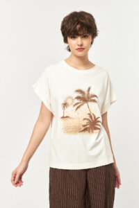 The Solace Offwhite Printed T-Shirt brings a relaxed, modern feel to everyday styling. Crafted from a soft single jersey fabric, the design features a subtle palm-inspired print that adds a calm, summery character. With its easy silhouette and lightweight structure, this piece offers effortless comfort while maintaining a refined, casual look.