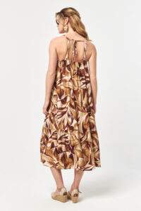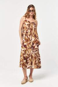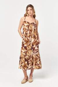 The Solace Painterly Brown Print Dress features a relaxed midi silhouette with delicate straps and a softly gathered hem for natural movement. Crafted from a lightweight woven fabric, the painterly all-over print adds warmth and depth, making this dress an effortless choice for summer days, resort wear, or relaxed everyday styling.
