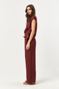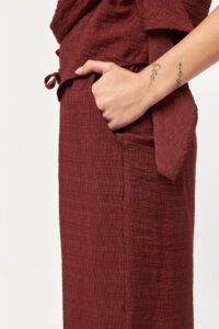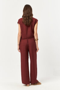 Designed for effortless movement and everyday comfort, the Solace Reddish Brown Relaxed Pants feature a fluid silhouette enhanced by a softly textured woven fabric. The elasticated waist and adjustable tie detail offer a comfortable, flexible fit, while the earthy reddish brown tone adds warmth and versatility to summer styling.