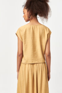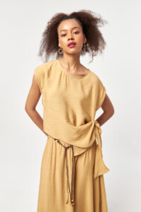 The Solace Side Tie Blouse in Beige offers a clean and effortless silhouette with a soft, modern drape. Crafted from a lightweight woven fabric, the asymmetric side tie detail adds subtle movement while gently shaping the waist. The relaxed fit, cap sleeves, and clean neckline provide all-day comfort and versatility. The neutral Beige tone creates a timeless look, making this blouse easy to style with both tonal pieces and contrasting colors for an understated, refined appearance.