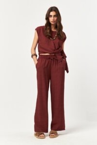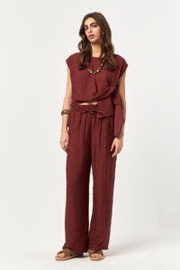 Designed with a softly textured woven fabric, this blouse features a distinctive side-tie detail that shapes the silhouette with natural drape. The relaxed fit and cap sleeves create an effortless balance between comfort and refined style. Its warm reddish brown tone adds depth, making it a versatile piece for both casual daytime looks and elevated summer evenings.