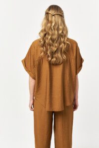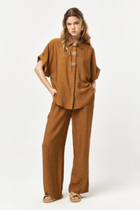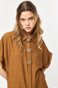 The Solace Snuff Embellished Shirt features a warm, earthy tone paired with a softly relaxed silhouette. Crafted from a lightweight woven fabric, the design is elevated by decorative embellished buttons that bring a refined yet distinctive accent. Effortless and versatile, this piece adds natural depth and understated elegance to everyday and summer-ready styling.
