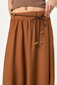 The Solace Snuff Fluid Long Skirt is defined by its warm, earthy tone and softly elongated silhouette. Crafted from a lightweight woven fabric, the design features an elasticated waistband with an adjustable drawstring for effortless comfort and ease. Subtle side slits enhance fluid movement, making this piece a versatile and refined choice for everyday and summer-ready styling.