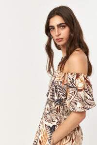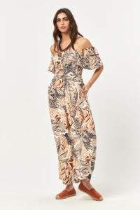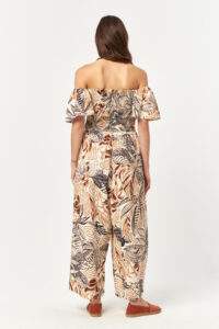 The Solace Wild Bloom Brown Print Jumpsuit features an off-shoulder neckline with a smocked bodice and wide-leg silhouette for relaxed summer comfort. Crafted from a lightweight woven fabric, the all-over floral print adds a natural, effortless charm, making it ideal for warm-weather days and resort-inspired styling.