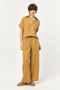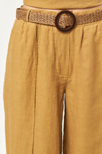 The Sunbelt Wide Leg Linen Pants – Caramel offer a soft, sun-warmed look with a naturally refined attitude. Designed with a high-waisted silhouette and clean front crease details, this style flows effortlessly with every step. The braided woven belt accentuates the waist while adding a handcrafted touch, perfectly complementing the caramel hue’s warm and earthy character.