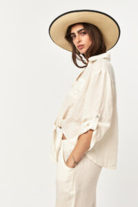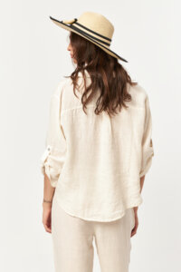 Clean and airy, the Ecru tone brings a soft, natural lightness to the linen texture. The button-down front, rollable sleeves, and tie-front hem create a relaxed yet refined silhouette, making it an effortless choice for fresh, warm-weather styling.