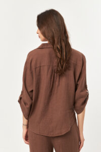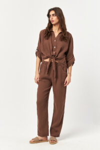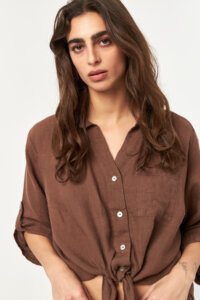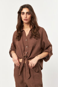 Warm and earthy, the Nesquik tone highlights the natural texture of linen with a rich, sun-baked feel. The button-down front, rollable sleeves, and tie-front hem come together to create an effortlessly relaxed silhouette, perfect for easy summer styling.