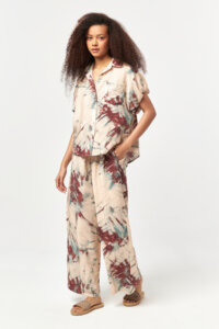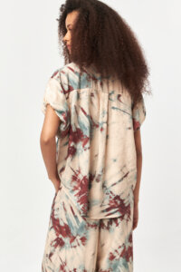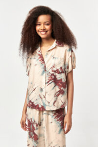 Designed with a relaxed shirt silhouette, this short-sleeve piece features a classic collar and full button-down front for effortless everyday wear. Crafted from a lightweight modal-blend fabric, it offers a soft, breathable feel with a fluid drape. The croquant and mold powder batic print brings an organic, artisanal character to the design, making this shirt a versatile choice for summer styling, coordinated sets, or easy standalone looks.
