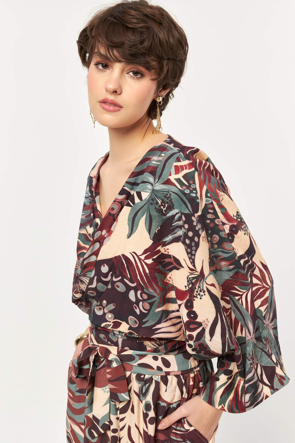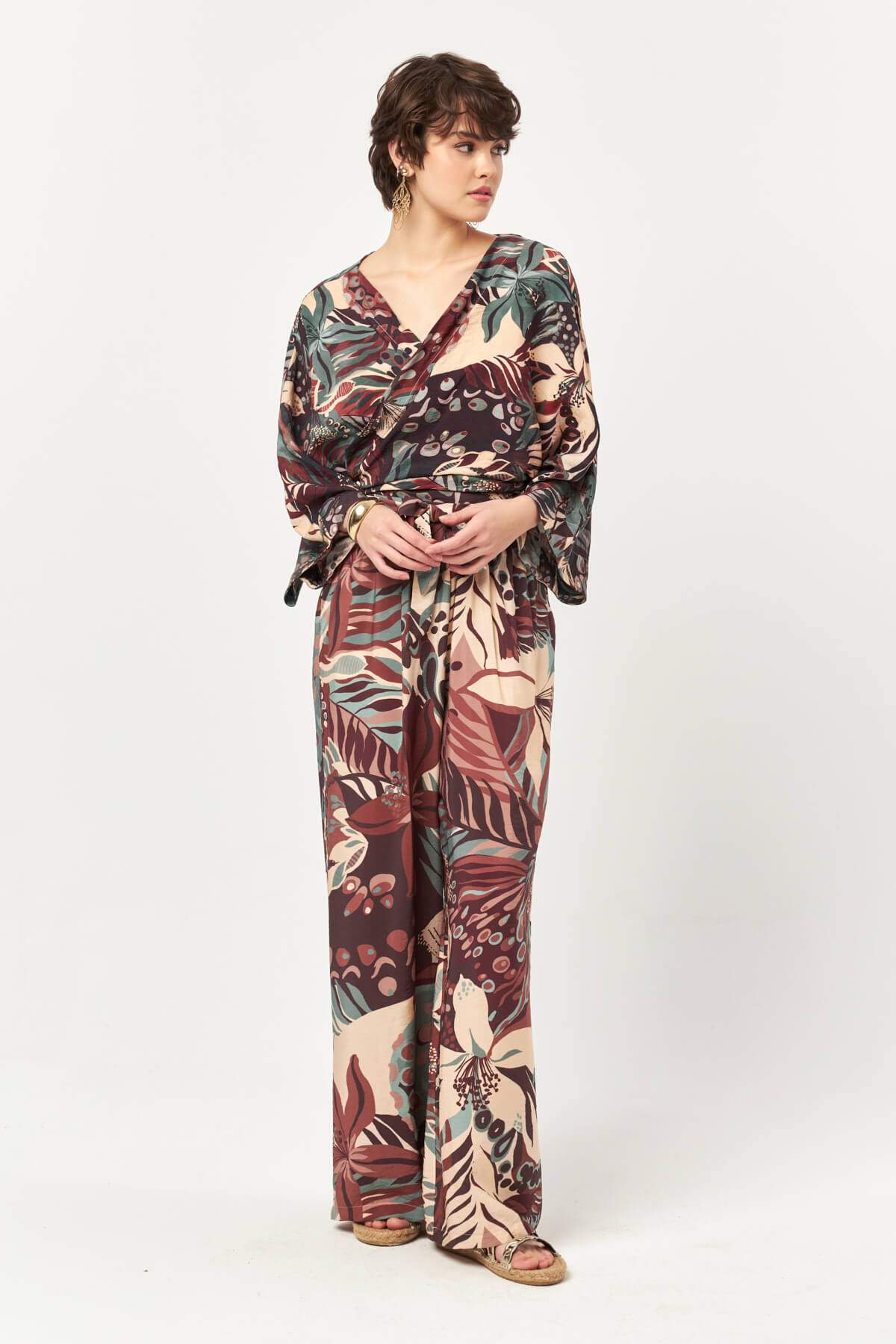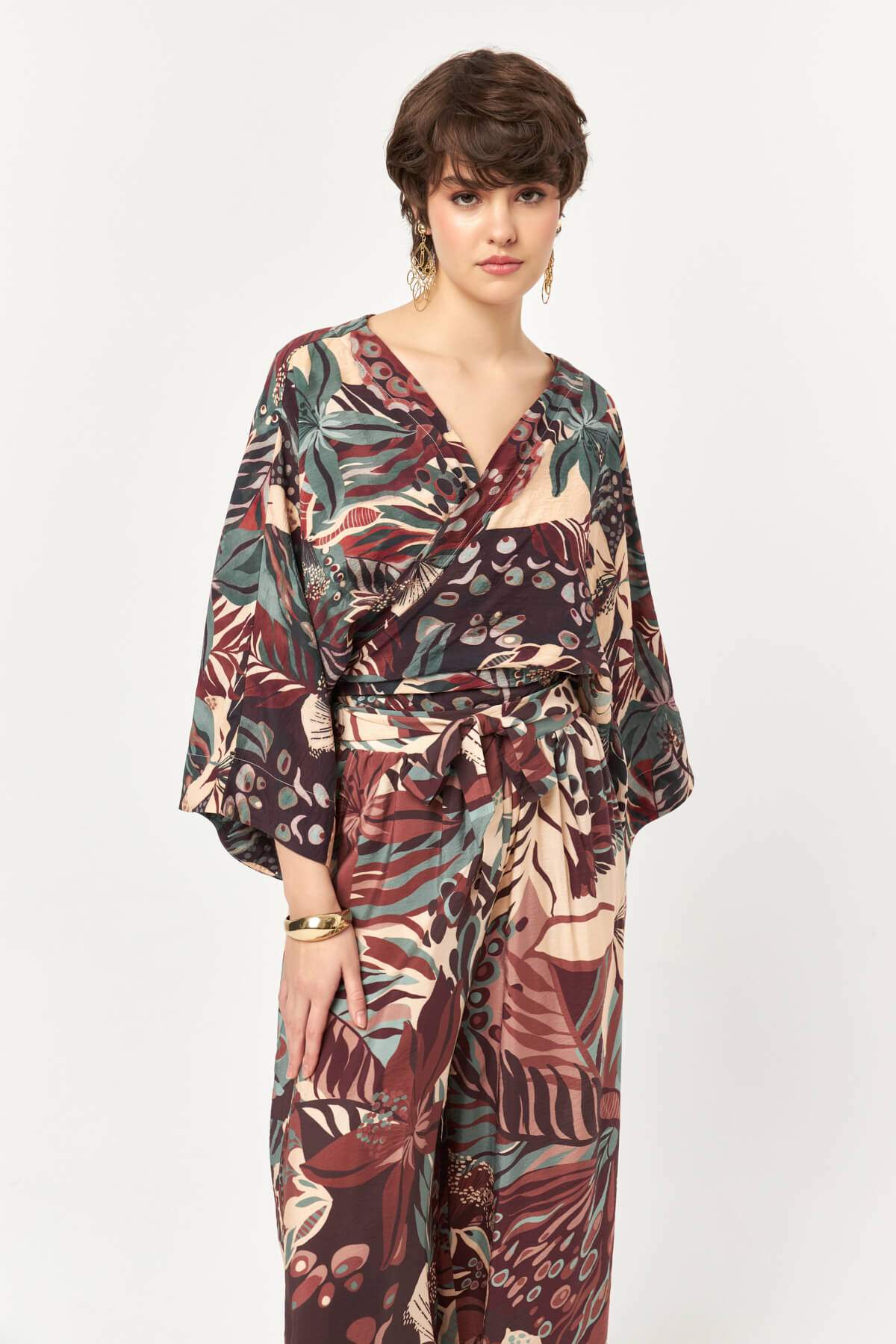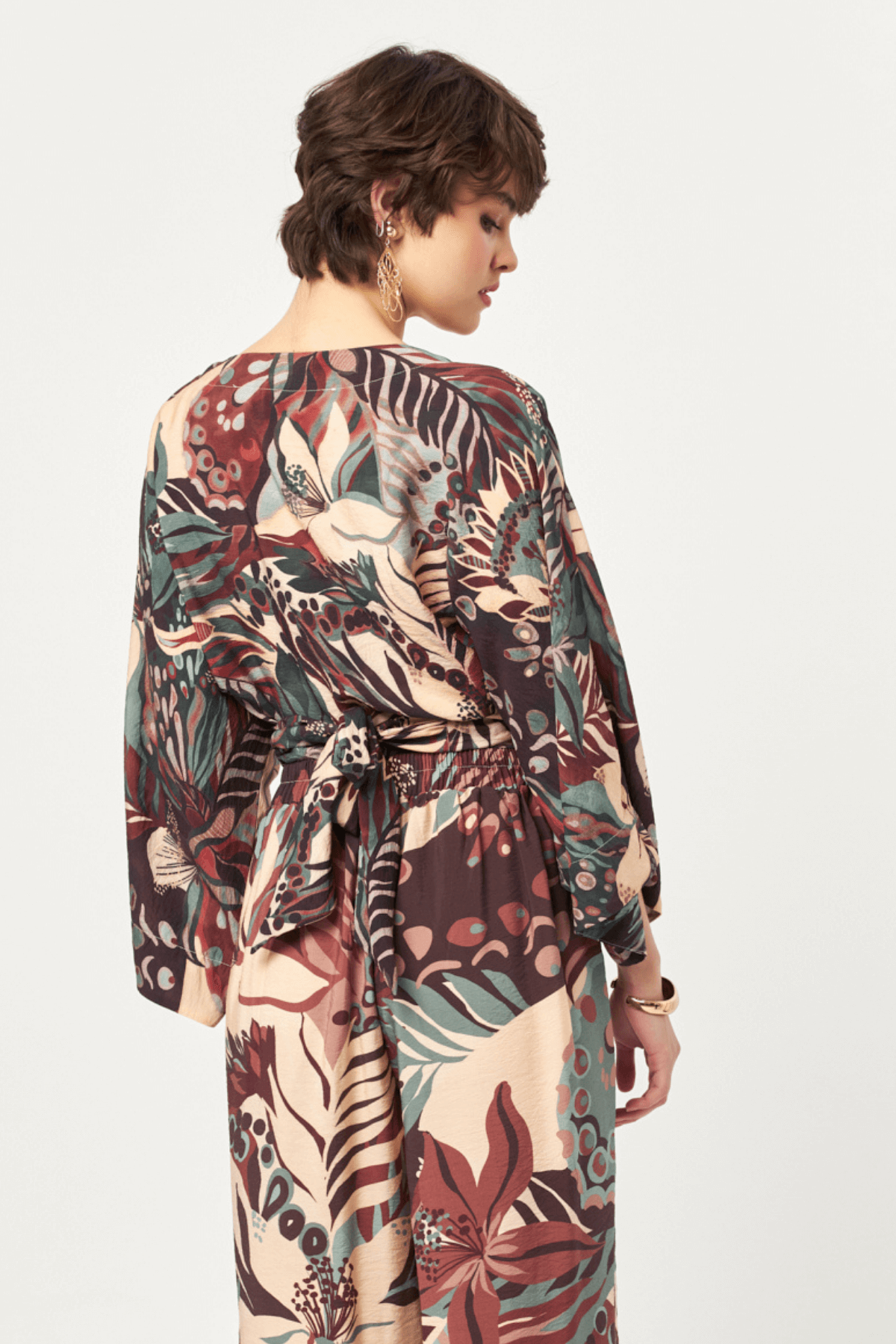 Designed with a fluid kimono silhouette, this multicolor piece features a deep V-neckline and an adjustable tie detail positioned just below the bust for a softly defined shape. Crafted from a lightweight modal-blend fabric, it drapes effortlessly over the body while offering breathable comfort. The expressive botanical print adds a statement finish, making this kimono an elevated choice for summer layering, resort styling, or coordinated looks.