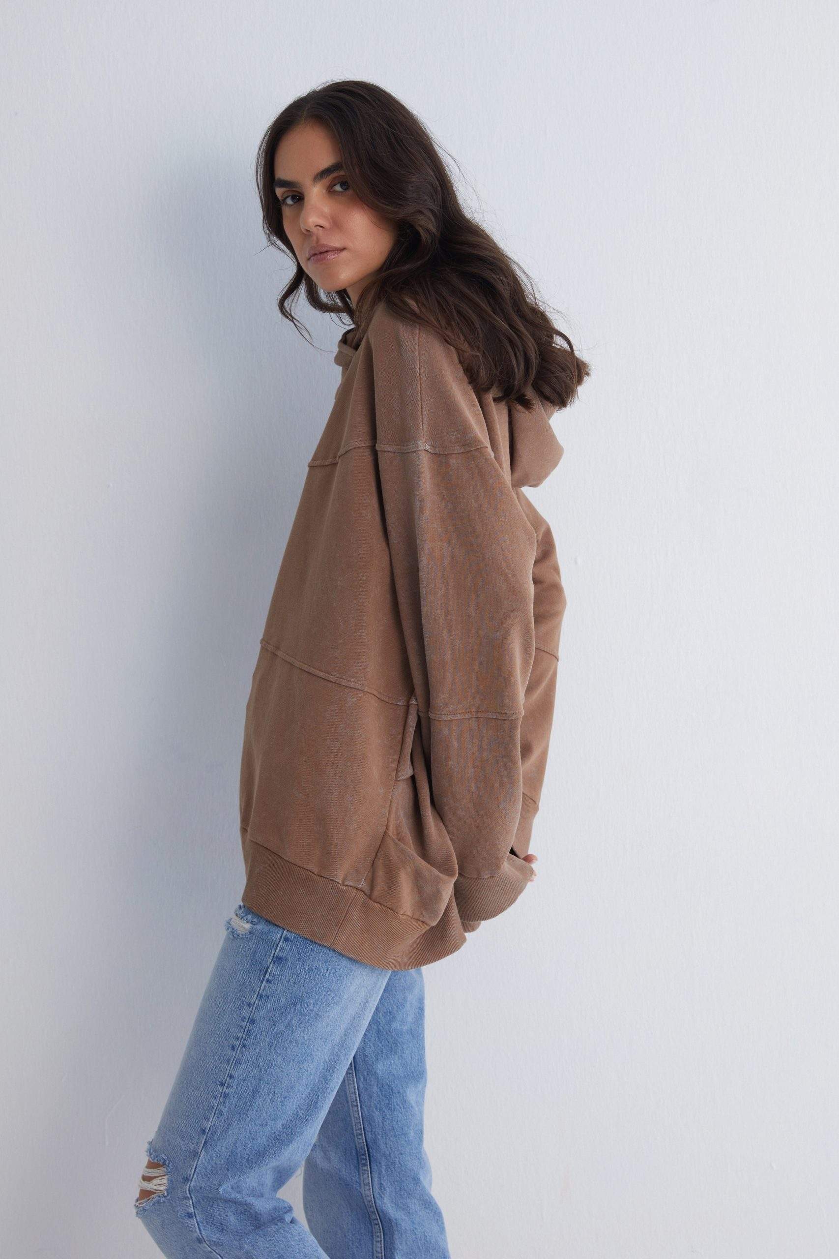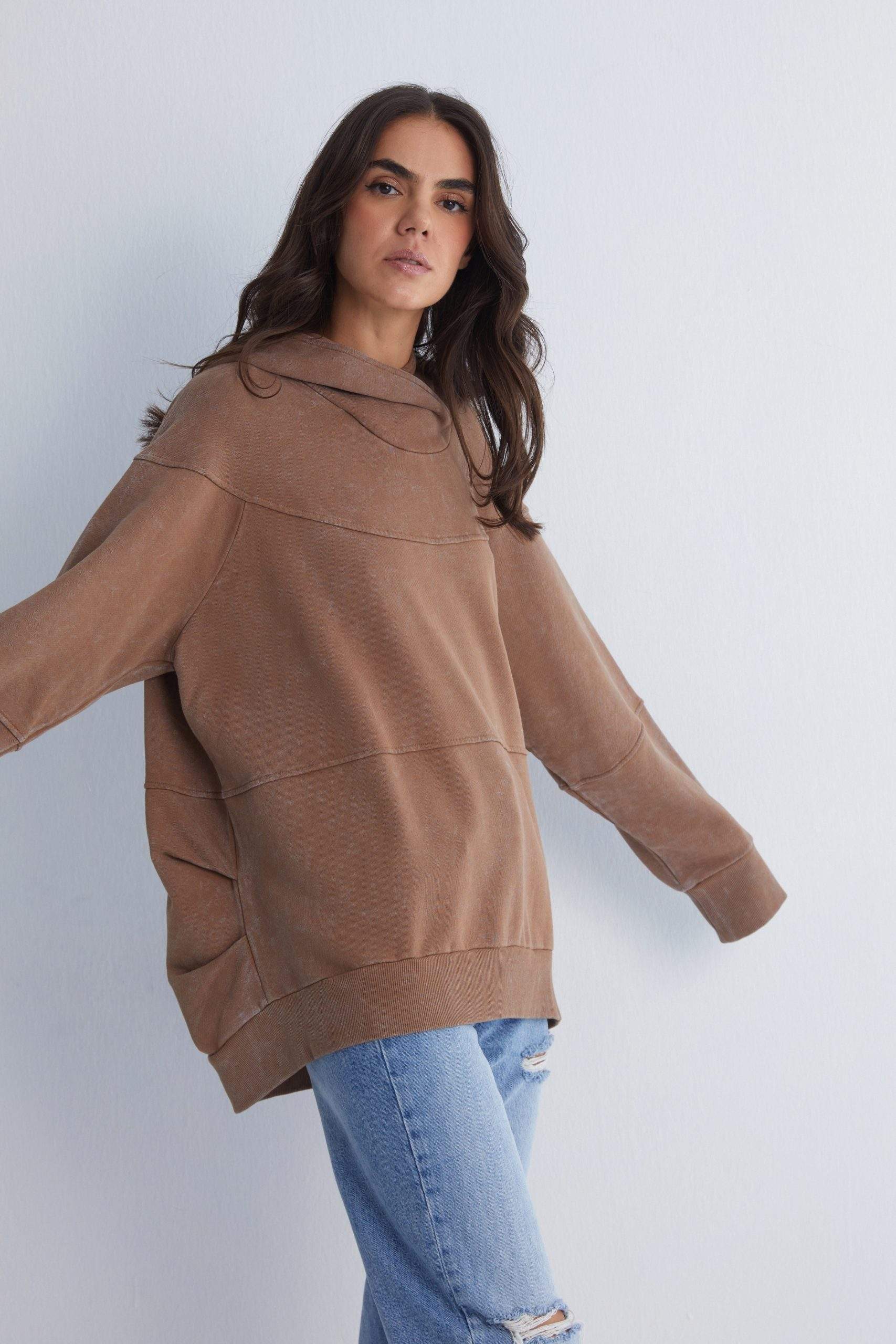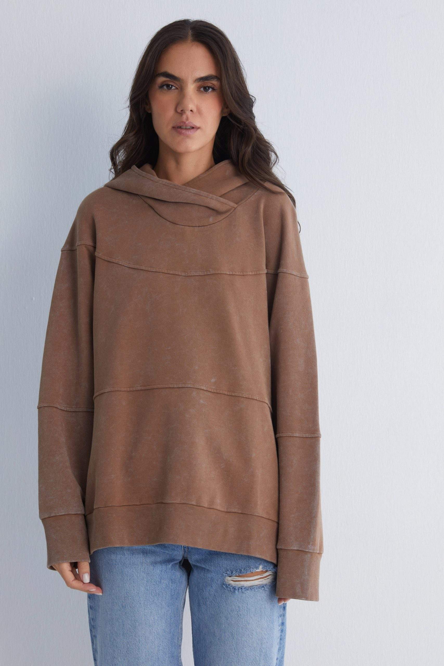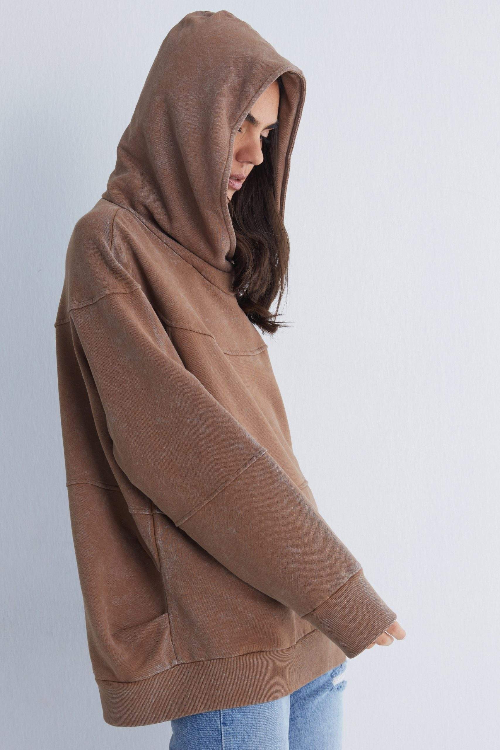 - High neckline with an oversized hood for a chic look.